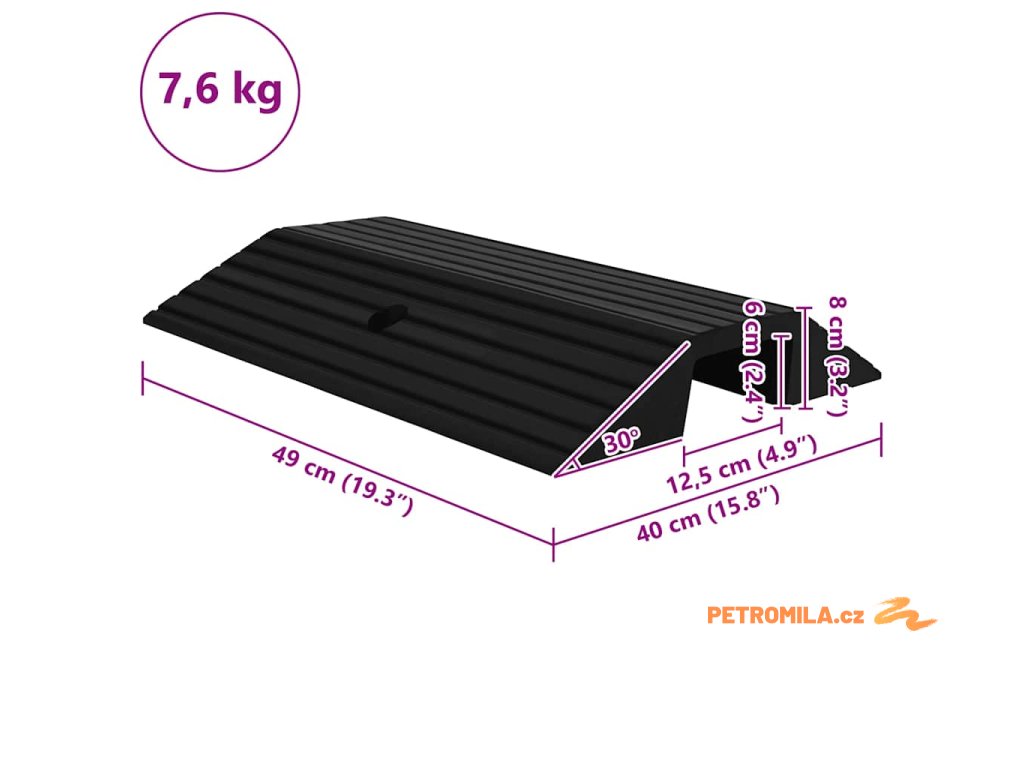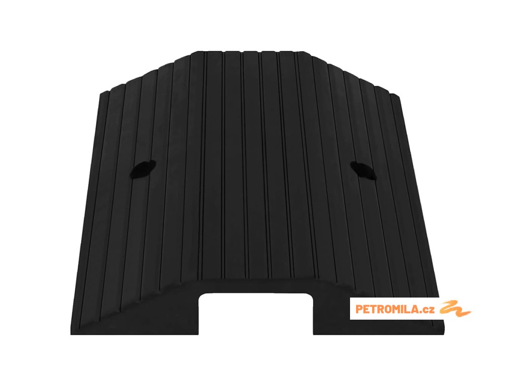 Přejezdová rampa je vyrobena z pevné pryže, je lehká a dostatečně odolná pro dlouhodobé používání. Drsný povrch má protiskluzovou strukturu, která pomáhá zabránit uklouznutí při nájezdu.