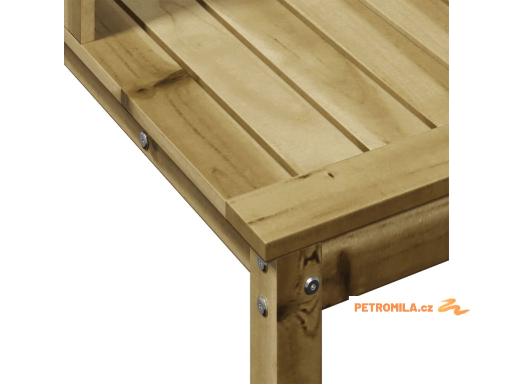 - Impregnované dřevo: Přesazovací stůl je vyroben z masivního borového dřeva. Masivní borové dřevo je krásný přírodní materiál. Borové dřevo má rovnou kresbu a obsahuje suky, které materiálu dodávají jeho charakteristický, rustikální vzhled. Impregnace je konzervační proces, který se provádí pomocí autoklávu. Tlaková úprava zvyšuje odolnost proti trouchnivění a počasí.