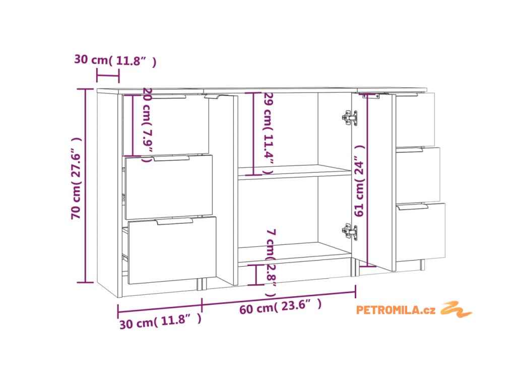 - Rozměry (příborník se 3 zásuvkami): 30 x 30 x 70 cm (Š x H x V)