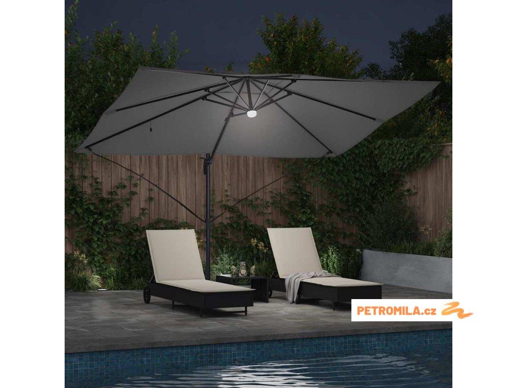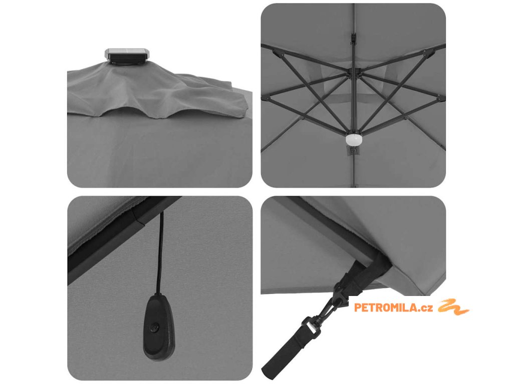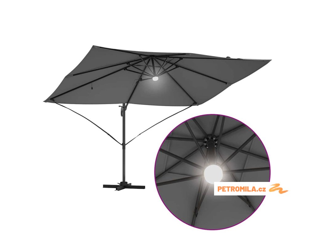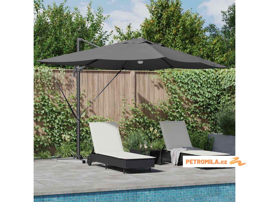 Materiály odolné proti UV záření Vyrobený z odolného polyesteru, deštník Roma je navržen tak, aby odolal dlouhodobému vystavení slunečnímu záření bez vyblednutí. Jeho funkce UV ochrany chrání vaši pokožku během relaxace na slunečných dnech, a zachovává živý vzhled deštníku po celou sezonu. Tato úroveň odolnosti zajišťuje, že vaše venkovní prostory zůstanou tak živé a přívětivé, jak byly v den zakoupení.,Otočení o 360° Deštník má manuální mechanismus, který umožňuje otáčení o 360 stupňů, což poskytuje přizpůsobené rozdělení stínu, jak se slunce pohybuje. Tato nastavitelnost vám umožňuje umístit deštník dokonale pro maximální efektivitu stínu, a zajišťuje pohodlí kdykoli a kdekoli sedíte ve své zahradě. Nabízí flexibilitu a pohodlí během jakékoli venkovní akce.,LED pásky Osvícený LED pásky, tento deštník přidává estetické a funkční osvětlení pro vaše večery. Tato světla zlepšují atmosféru pro noční schůzky, umožňující vám pořádat večeře dlouho po západu slunce. Osvětlení může zvýraznit moderní design a zároveň poskytovat praktickou viditelnost v šeru.,Moderní design Zaměřený na jednoduchost a funkčnost, deštník se pyšní čistými liniemi a minimálními ozdobami, což z něj činí ideální volbu pro současné venkovní prostory. Jeho moderní vzhled hladce ladí s různými zahradními designy, zvyšující celkovou estetiku vašeho venkovního obytného prostoru.,Podrobnosti o montáži Dodán s snadno sledovatelným montážním návodem, deštník vyžaduje šroubovák pro sestavení. Doporučuje se účast dvou osob pro ergonomické sestavení, usnadňující hladký montážní proces, který vás rychle připraví na užívání sluneční ochrany. Komponenty deštníku se spojují bez problémů, zajišťující bezproblémovou montáž a stabilitu pro komerční i rezidenční použití.- Barva: Antracitová a černá