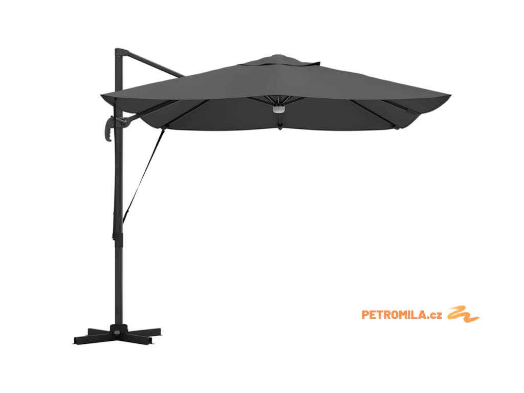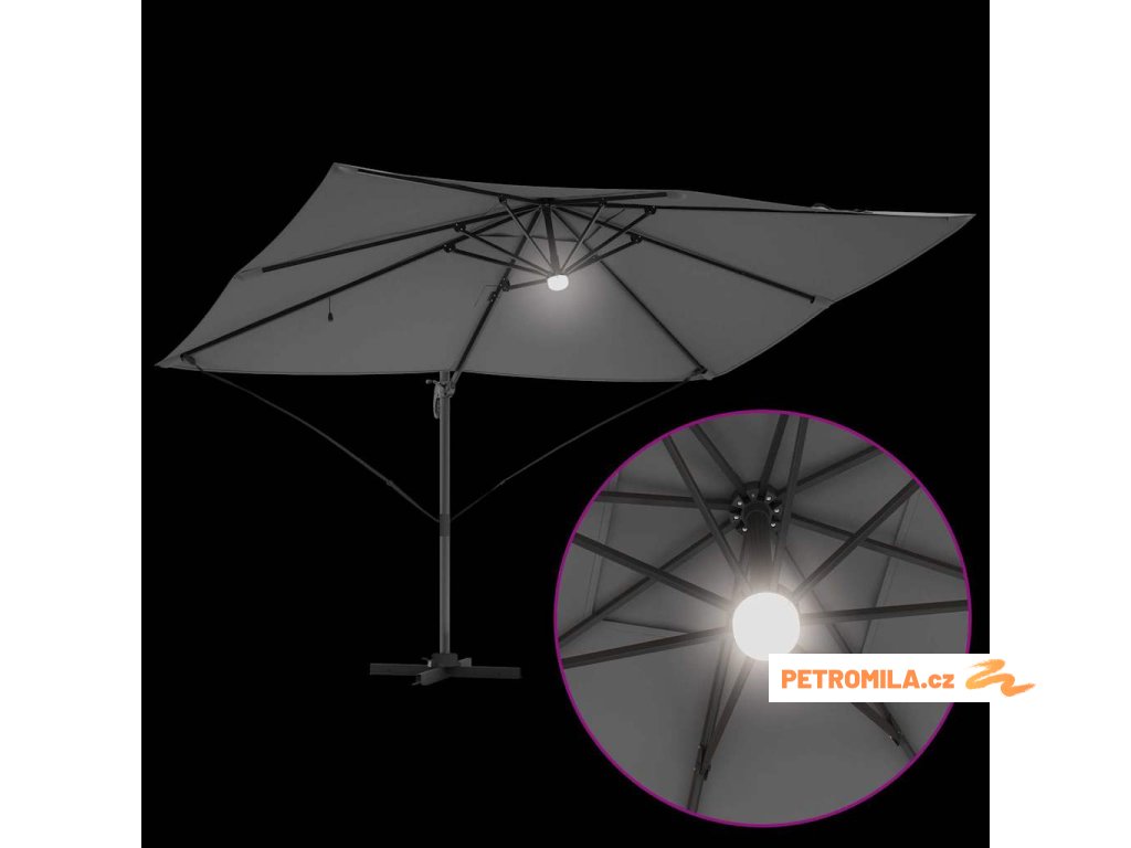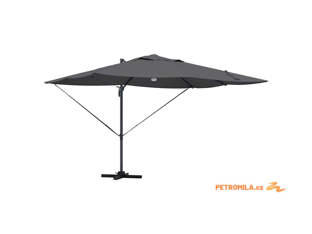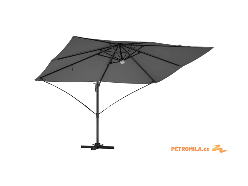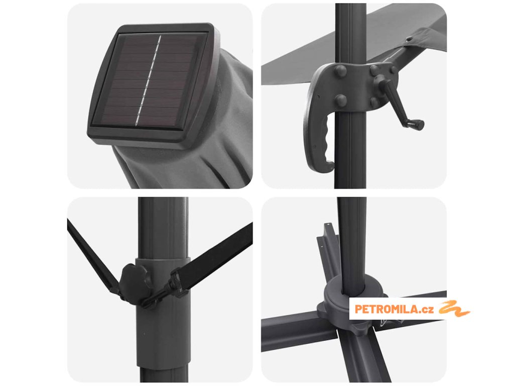 Materiály odolné proti UV záření Vyrobený z odolného polyesteru, deštník Roma je navržen tak, aby odolal dlouhodobému vystavení slunečnímu záření bez vyblednutí. Jeho funkce UV ochrany chrání vaši pokožku během relaxace na slunečných dnech, a zachovává živý vzhled deštníku po celou sezonu. Tato úroveň odolnosti zajišťuje, že vaše venkovní prostory zůstanou tak živé a přívětivé, jak byly v den zakoupení.,Otočení o 360° Deštník má manuální mechanismus, který umožňuje otáčení o 360 stupňů, což poskytuje přizpůsobené rozdělení stínu, jak se slunce pohybuje. Tato nastavitelnost vám umožňuje umístit deštník dokonale pro maximální efektivitu stínu, a zajišťuje pohodlí kdykoli a kdekoli sedíte ve své zahradě. Nabízí flexibilitu a pohodlí během jakékoli venkovní akce.,LED pásky Osvícený LED pásky, tento deštník přidává estetické a funkční osvětlení pro vaše večery. Tato světla zlepšují atmosféru pro noční schůzky, umožňující vám pořádat večeře dlouho po západu slunce. Osvětlení může zvýraznit moderní design a zároveň poskytovat praktickou viditelnost v šeru.,Moderní design Zaměřený na jednoduchost a funkčnost, deštník se pyšní čistými liniemi a minimálními ozdobami, což z něj činí ideální volbu pro současné venkovní prostory. Jeho moderní vzhled hladce ladí s různými zahradními designy, zvyšující celkovou estetiku vašeho venkovního obytného prostoru.,Podrobnosti o montáži Dodán s snadno sledovatelným montážním návodem, deštník vyžaduje šroubovák pro sestavení. Doporučuje se účast dvou osob pro ergonomické sestavení, usnadňující hladký montážní proces, který vás rychle připraví na užívání sluneční ochrany. Komponenty deštníku se spojují bez problémů, zajišťující bezproblémovou montáž a stabilitu pro komerční i rezidenční použití.- Barva: Antracitová a černá