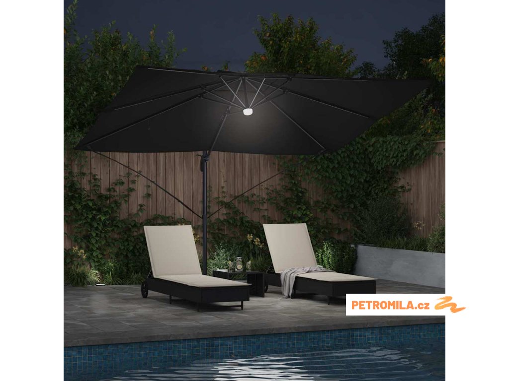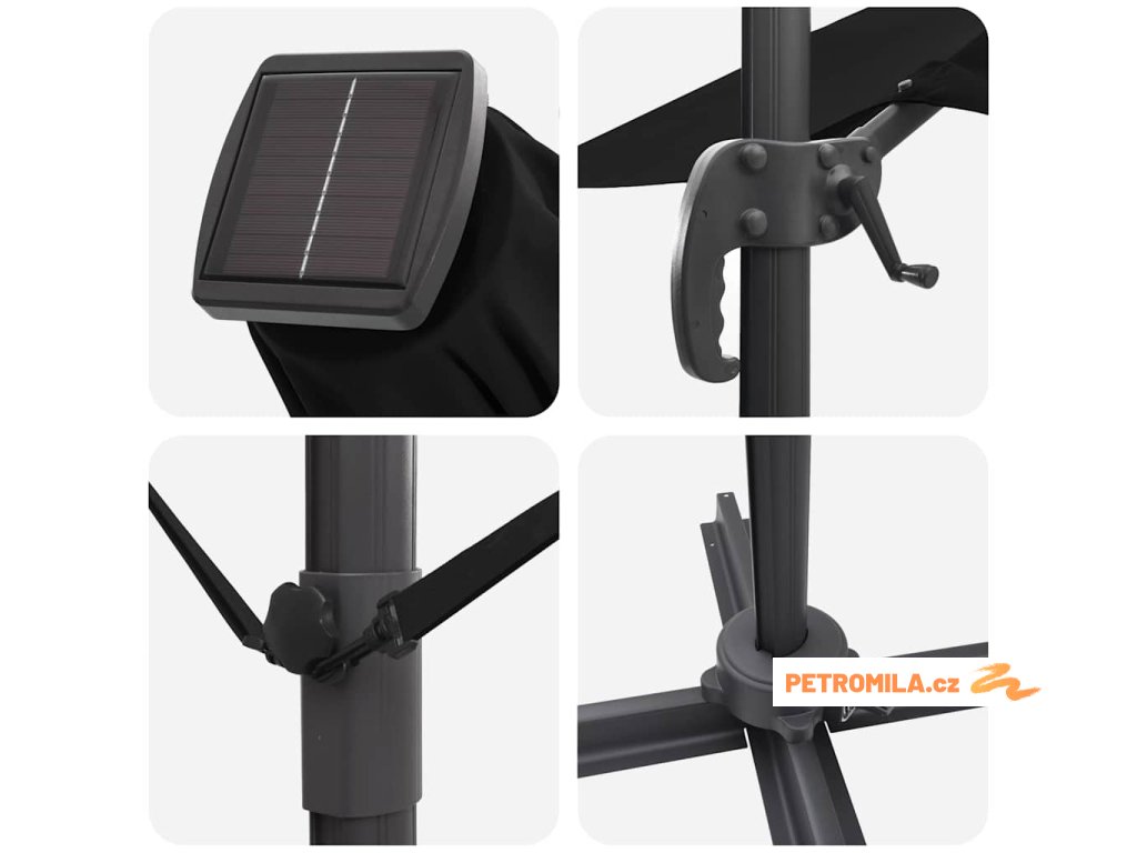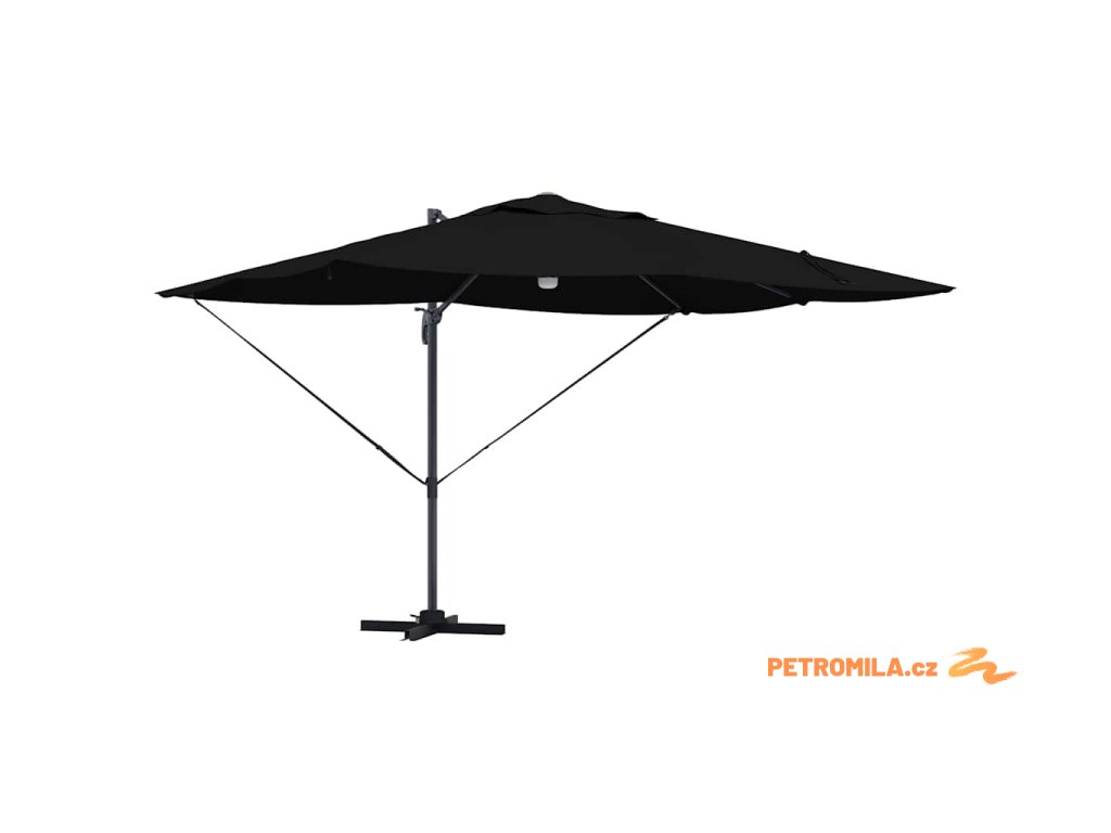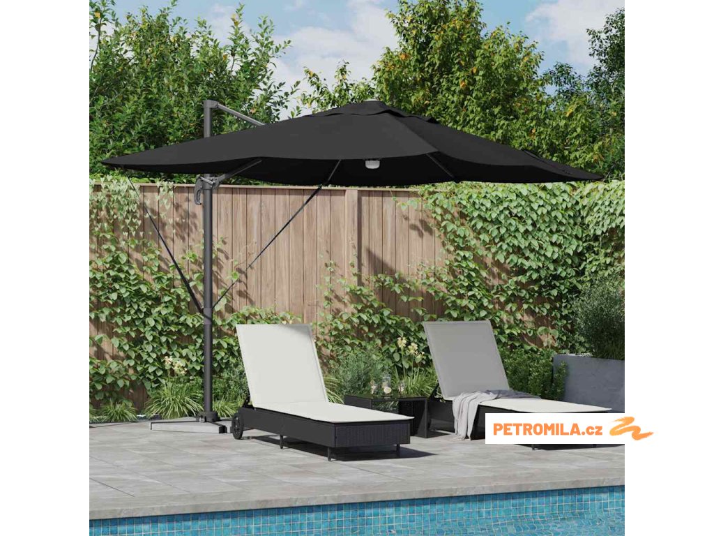 Materiály odolné proti UV záření Vyrobený z odolného polyesteru, deštník Roma je navržen tak, aby odolal dlouhodobému vystavení slunečnímu záření bez vyblednutí. Jeho funkce UV ochrany chrání vaši pokožku během relaxace na slunečných dnech, a zachovává živý vzhled deštníku po celou sezonu. Tato úroveň odolnosti zajišťuje, že vaše venkovní prostory zůstanou tak živé a přívětivé, jak byly v den zakoupení.,Otočení o 360° Deštník má manuální mechanismus, který umožňuje otáčení o 360 stupňů, což poskytuje přizpůsobené rozdělení stínu, jak se slunce pohybuje. Tato nastavitelnost vám umožňuje umístit deštník dokonale pro maximální efektivitu stínu, a zajišťuje pohodlí kdykoli a kdekoli sedíte ve své zahradě. Nabízí flexibilitu a pohodlí během jakékoli venkovní akce.,LED pásky Osvícený LED pásky, tento deštník přidává estetické a funkční osvětlení pro vaše večery. Tato světla zlepšují atmosféru pro noční schůzky, umožňující vám pořádat večeře dlouho po západu slunce. Osvětlení může zvýraznit moderní design a zároveň poskytovat praktickou viditelnost v šeru.,Moderní design Zaměřený na jednoduchost a funkčnost, deštník se pyšní čistými liniemi a minimálními ozdobami, což z něj činí ideální volbu pro současné venkovní prostory. Jeho moderní vzhled hladce ladí s různými zahradními designy, zvyšující celkovou estetiku vašeho venkovního obytného prostoru.,Podrobnosti o montáži Dodán s snadno sledovatelným montážním návodem, deštník vyžaduje šroubovák pro sestavení. Doporučuje se účast dvou osob pro ergonomické sestavení, usnadňující hladký montážní proces, který vás rychle připraví na užívání sluneční ochrany. Komponenty deštníku se spojují bez problémů, zajišťující bezproblémovou montáž a stabilitu pro komerční i rezidenční použití.- Barva: Černá a černá