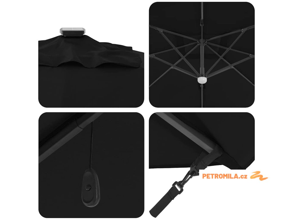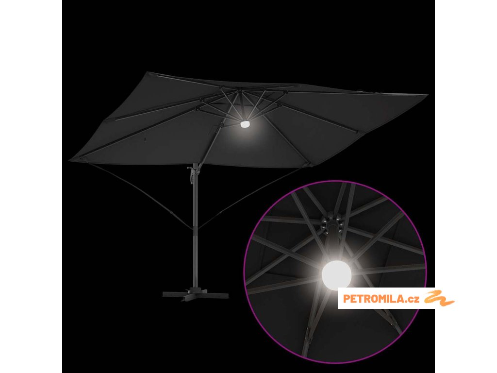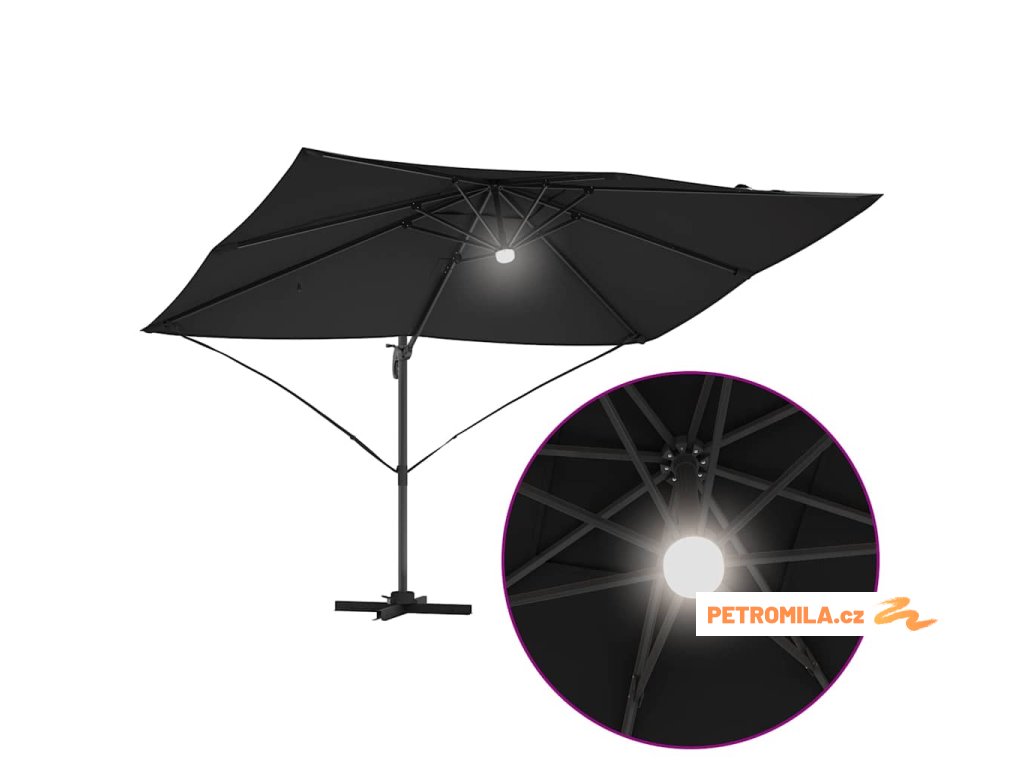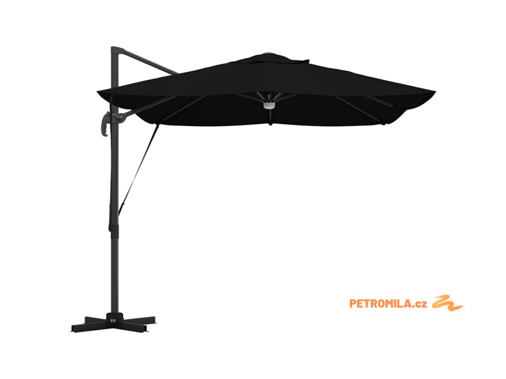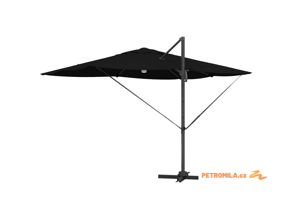 Materiály odolné proti UV záření Vyrobený z odolného polyesteru, deštník Roma je navržen tak, aby odolal dlouhodobému vystavení slunečnímu záření bez vyblednutí. Jeho funkce UV ochrany chrání vaši pokožku během relaxace na slunečných dnech, a zachovává živý vzhled deštníku po celou sezonu. Tato úroveň odolnosti zajišťuje, že vaše venkovní prostory zůstanou tak živé a přívětivé, jak byly v den zakoupení.,Otočení o 360° Deštník má manuální mechanismus, který umožňuje otáčení o 360 stupňů, což poskytuje přizpůsobené rozdělení stínu, jak se slunce pohybuje. Tato nastavitelnost vám umožňuje umístit deštník dokonale pro maximální efektivitu stínu, a zajišťuje pohodlí kdykoli a kdekoli sedíte ve své zahradě. Nabízí flexibilitu a pohodlí během jakékoli venkovní akce.,LED pásky Osvícený LED pásky, tento deštník přidává estetické a funkční osvětlení pro vaše večery. Tato světla zlepšují atmosféru pro noční schůzky, umožňující vám pořádat večeře dlouho po západu slunce. Osvětlení může zvýraznit moderní design a zároveň poskytovat praktickou viditelnost v šeru.,Moderní design Zaměřený na jednoduchost a funkčnost, deštník se pyšní čistými liniemi a minimálními ozdobami, což z něj činí ideální volbu pro současné venkovní prostory. Jeho moderní vzhled hladce ladí s různými zahradními designy, zvyšující celkovou estetiku vašeho venkovního obytného prostoru.,Podrobnosti o montáži Dodán s snadno sledovatelným montážním návodem, deštník vyžaduje šroubovák pro sestavení. Doporučuje se účast dvou osob pro ergonomické sestavení, usnadňující hladký montážní proces, který vás rychle připraví na užívání sluneční ochrany. Komponenty deštníku se spojují bez problémů, zajišťující bezproblémovou montáž a stabilitu pro komerční i rezidenční použití.- Barva: Černá a černá