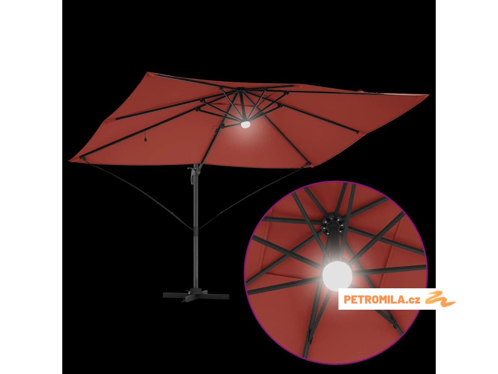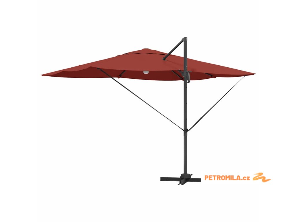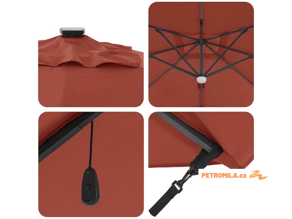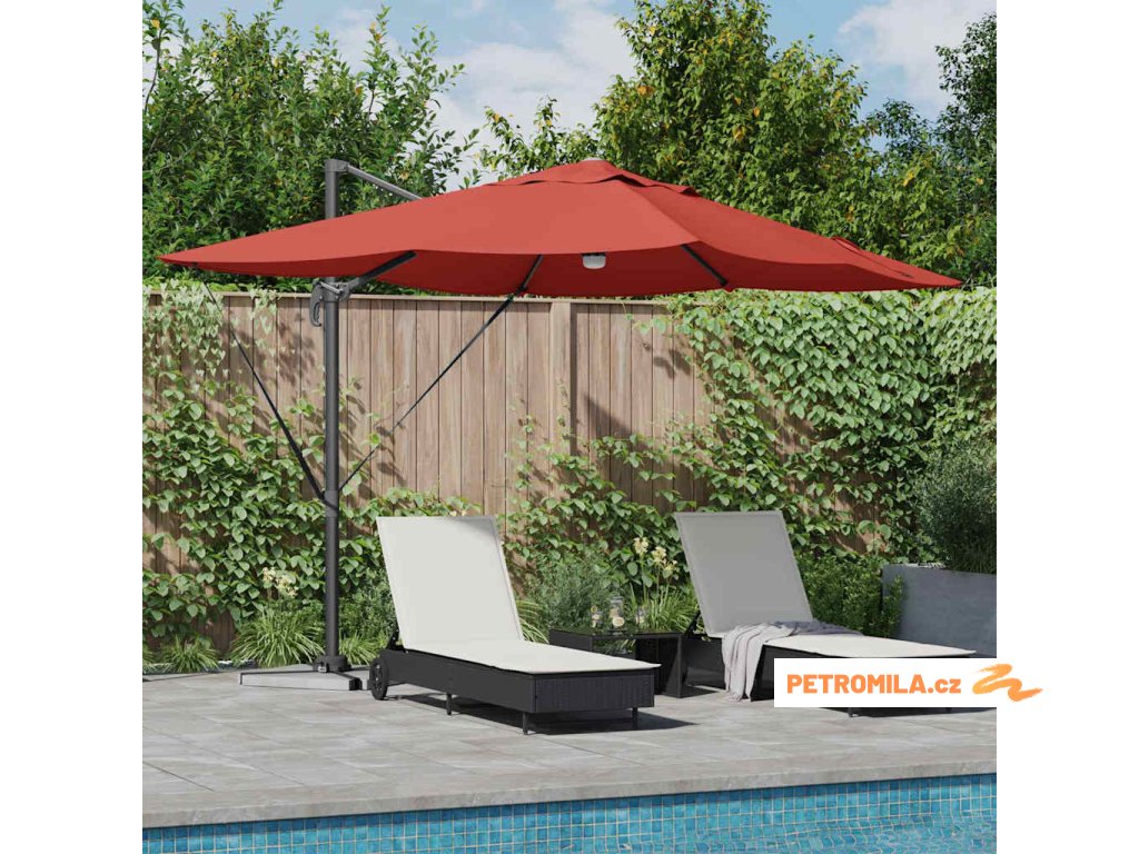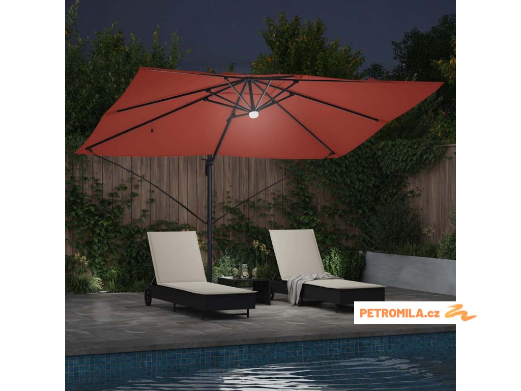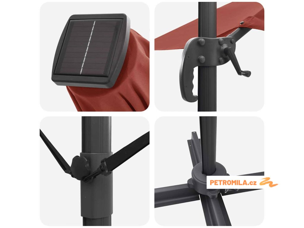 Materiály odolné proti UV záření Vyrobený z odolného polyesteru, deštník Roma je navržen tak, aby odolal dlouhodobému vystavení slunečnímu záření bez vyblednutí. Jeho funkce UV ochrany chrání vaši pokožku během relaxace na slunečných dnech, a zachovává živý vzhled deštníku po celou sezonu. Tato úroveň odolnosti zajišťuje, že vaše venkovní prostory zůstanou tak živé a přívětivé, jak byly v den zakoupení.,Otočení o 360° Deštník má manuální mechanismus, který umožňuje otáčení o 360 stupňů, což poskytuje přizpůsobené rozdělení stínu, jak se slunce pohybuje. Tato nastavitelnost vám umožňuje umístit deštník dokonale pro maximální efektivitu stínu, a zajišťuje pohodlí kdykoli a kdekoli sedíte ve své zahradě. Nabízí flexibilitu a pohodlí během jakékoli venkovní akce.,LED pásky Osvícený LED pásky, tento deštník přidává estetické a funkční osvětlení pro vaše večery. Tato světla zlepšují atmosféru pro noční schůzky, umožňující vám pořádat večeře dlouho po západu slunce. Osvětlení může zvýraznit moderní design a zároveň poskytovat praktickou viditelnost v šeru.,Moderní design Zaměřený na jednoduchost a funkčnost, deštník se pyšní čistými liniemi a minimálními ozdobami, což z něj činí ideální volbu pro současné venkovní prostory. Jeho moderní vzhled hladce ladí s různými zahradními designy, zvyšující celkovou estetiku vašeho venkovního obytného prostoru.,Podrobnosti o montáži Dodán s snadno sledovatelným montážním návodem, deštník vyžaduje šroubovák pro sestavení. Doporučuje se účast dvou osob pro ergonomické sestavení, usnadňující hladký montážní proces, který vás rychle připraví na užívání sluneční ochrany. Komponenty deštníku se spojují bez problémů, zajišťující bezproblémovou montáž a stabilitu pro komerční i rezidenční použití.- Barva: Červená a černá