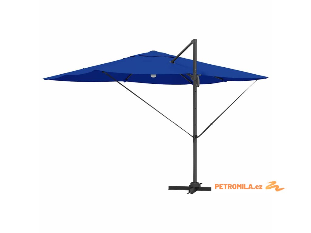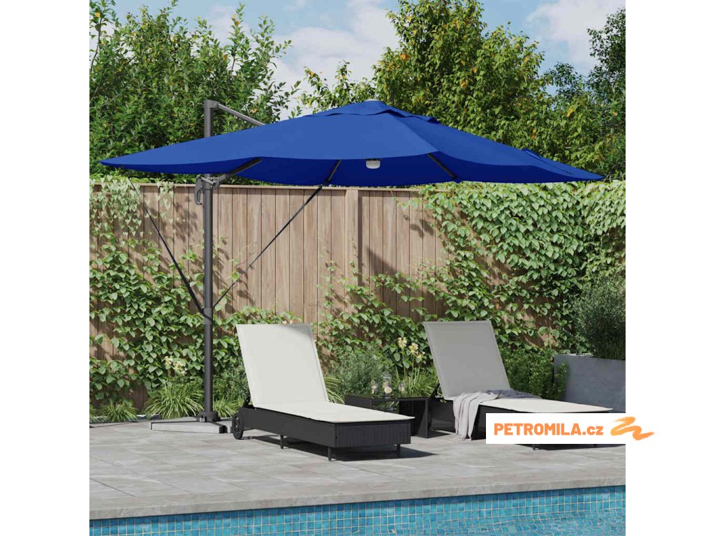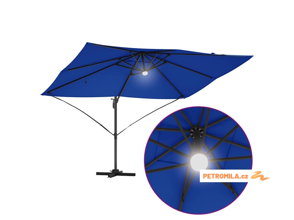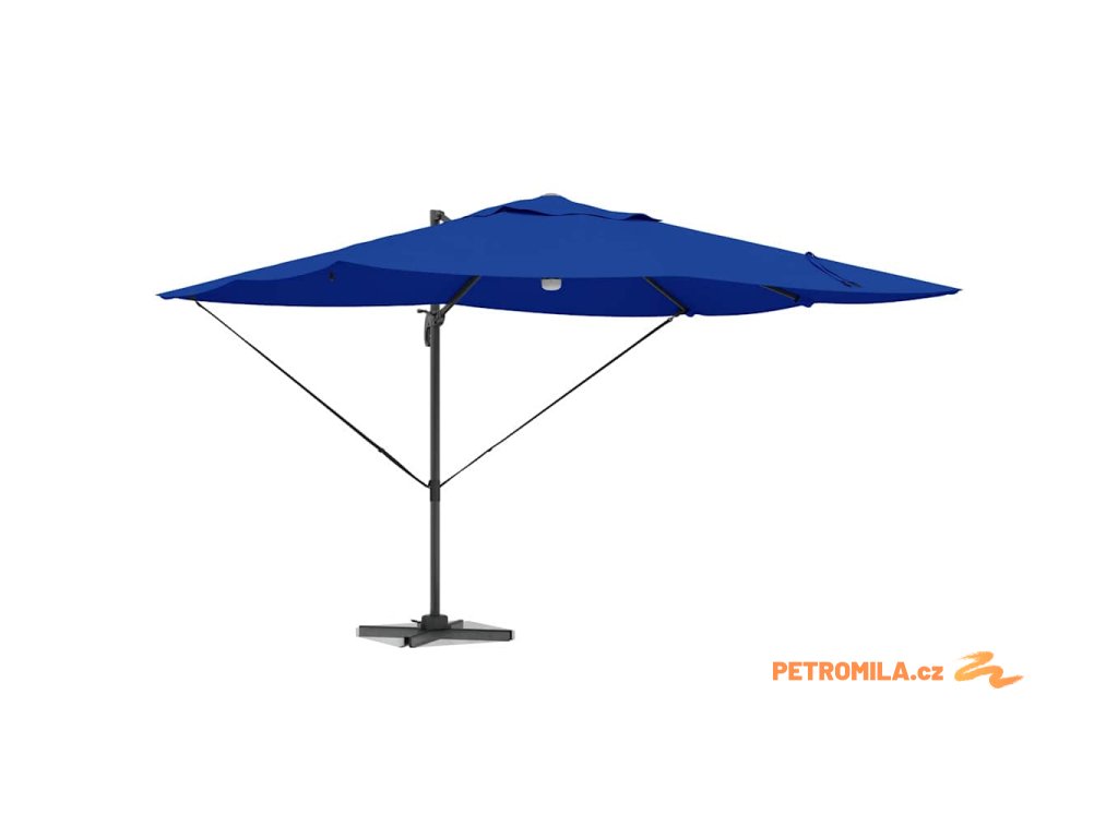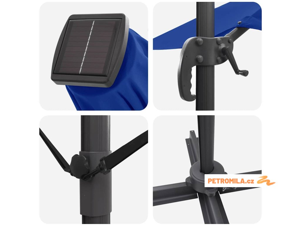 Materiály odolné proti UV záření Vyrobený z odolného polyesteru, deštník Roma je navržen tak, aby odolal dlouhodobému vystavení slunečnímu záření bez vyblednutí. Jeho funkce UV ochrany chrání vaši pokožku během relaxace na slunečných dnech, a zachovává živý vzhled deštníku po celou sezonu. Tato úroveň odolnosti zajišťuje, že vaše venkovní prostory zůstanou tak živé a přívětivé, jak byly v den zakoupení.,Otočení o 360° Deštník má manuální mechanismus, který umožňuje otáčení o 360 stupňů, což poskytuje přizpůsobené rozdělení stínu, jak se slunce pohybuje. Tato nastavitelnost vám umožňuje umístit deštník dokonale pro maximální efektivitu stínu, a zajišťuje pohodlí kdykoli a kdekoli sedíte ve své zahradě. Nabízí flexibilitu a pohodlí během jakékoli venkovní akce.,LED pásky Osvícený LED pásky, tento deštník přidává estetické a funkční osvětlení pro vaše večery. Tato světla zlepšují atmosféru pro noční schůzky, umožňující vám pořádat večeře dlouho po západu slunce. Osvětlení může zvýraznit moderní design a zároveň poskytovat praktickou viditelnost v šeru.,Moderní design Zaměřený na jednoduchost a funkčnost, deštník se pyšní čistými liniemi a minimálními ozdobami, což z něj činí ideální volbu pro současné venkovní prostory. Jeho moderní vzhled hladce ladí s různými zahradními designy, zvyšující celkovou estetiku vašeho venkovního obytného prostoru.,Podrobnosti o montáži Dodán s snadno sledovatelným montážním návodem, deštník vyžaduje šroubovák pro sestavení. Doporučuje se účast dvou osob pro ergonomické sestavení, usnadňující hladký montážní proces, který vás rychle připraví na užívání sluneční ochrany. Komponenty deštníku se spojují bez problémů, zajišťující bezproblémovou montáž a stabilitu pro komerční i rezidenční použití.- Barva: Modrá a černá