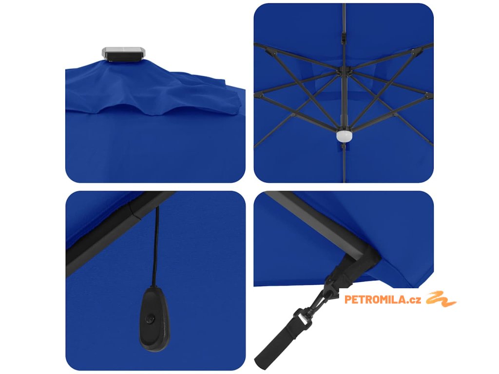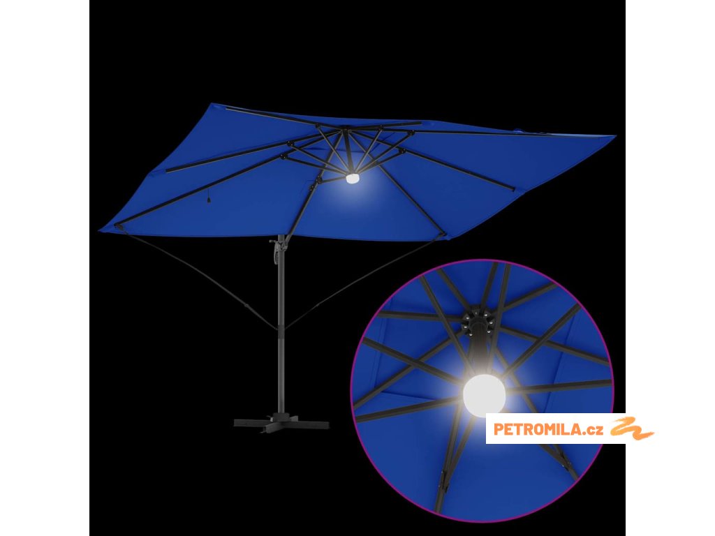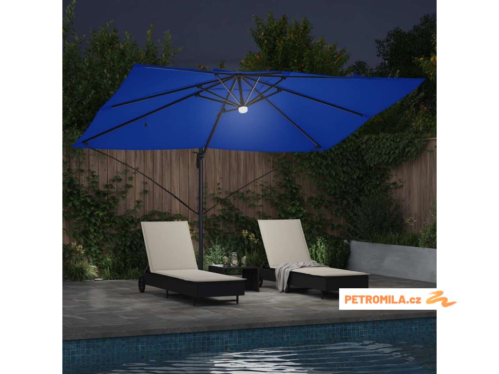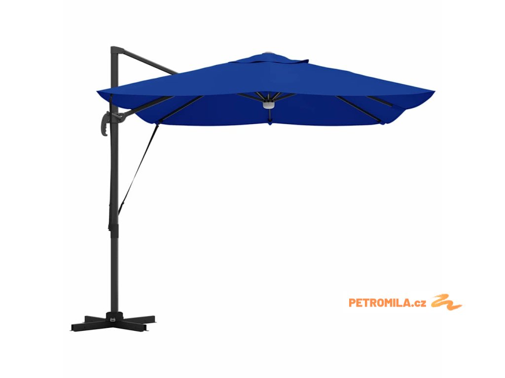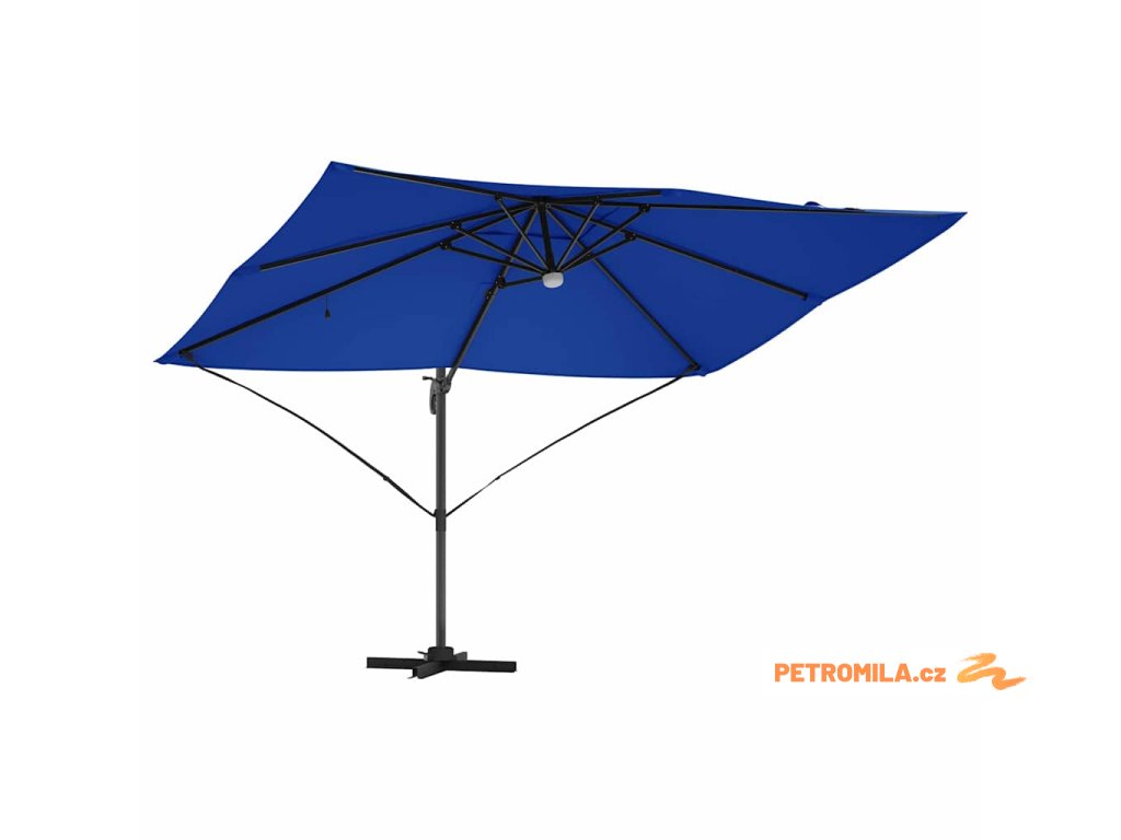 Materiály odolné proti UV záření Vyrobený z odolného polyesteru, deštník Roma je navržen tak, aby odolal dlouhodobému vystavení slunečnímu záření bez vyblednutí. Jeho funkce UV ochrany chrání vaši pokožku během relaxace na slunečných dnech, a zachovává živý vzhled deštníku po celou sezonu. Tato úroveň odolnosti zajišťuje, že vaše venkovní prostory zůstanou tak živé a přívětivé, jak byly v den zakoupení.,Otočení o 360° Deštník má manuální mechanismus, který umožňuje otáčení o 360 stupňů, což poskytuje přizpůsobené rozdělení stínu, jak se slunce pohybuje. Tato nastavitelnost vám umožňuje umístit deštník dokonale pro maximální efektivitu stínu, a zajišťuje pohodlí kdykoli a kdekoli sedíte ve své zahradě. Nabízí flexibilitu a pohodlí během jakékoli venkovní akce.,LED pásky Osvícený LED pásky, tento deštník přidává estetické a funkční osvětlení pro vaše večery. Tato světla zlepšují atmosféru pro noční schůzky, umožňující vám pořádat večeře dlouho po západu slunce. Osvětlení může zvýraznit moderní design a zároveň poskytovat praktickou viditelnost v šeru.,Moderní design Zaměřený na jednoduchost a funkčnost, deštník se pyšní čistými liniemi a minimálními ozdobami, což z něj činí ideální volbu pro současné venkovní prostory. Jeho moderní vzhled hladce ladí s různými zahradními designy, zvyšující celkovou estetiku vašeho venkovního obytného prostoru.,Podrobnosti o montáži Dodán s snadno sledovatelným montážním návodem, deštník vyžaduje šroubovák pro sestavení. Doporučuje se účast dvou osob pro ergonomické sestavení, usnadňující hladký montážní proces, který vás rychle připraví na užívání sluneční ochrany. Komponenty deštníku se spojují bez problémů, zajišťující bezproblémovou montáž a stabilitu pro komerční i rezidenční použití.- Barva: Modrá a černá