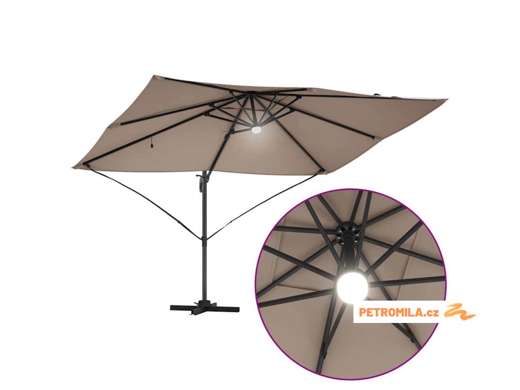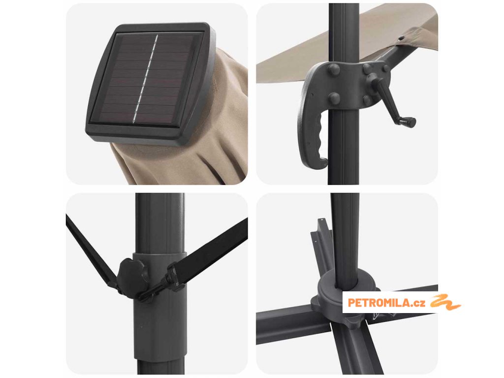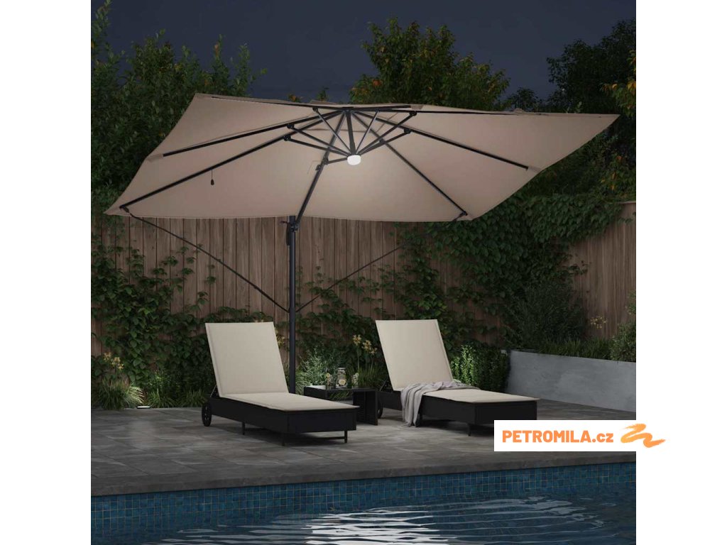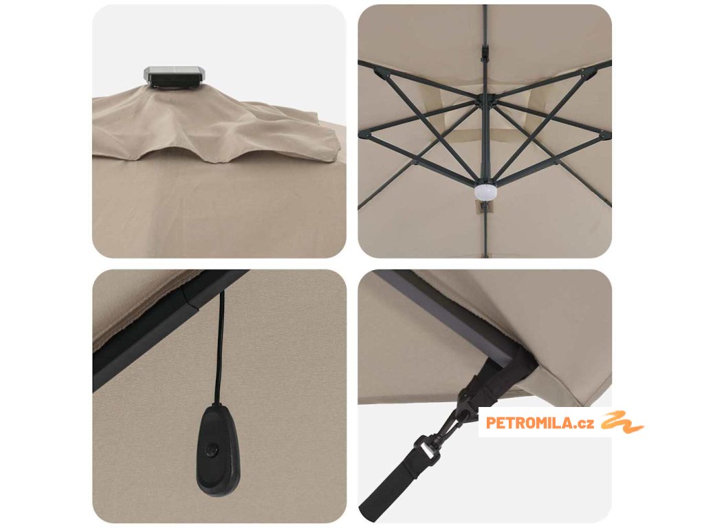 Materiály odolné proti UV záření Vyrobený z odolného polyesteru, deštník Roma je navržen tak, aby odolal dlouhodobému vystavení slunečnímu záření bez vyblednutí. Jeho funkce UV ochrany chrání vaši pokožku během relaxace na slunečných dnech, a zachovává živý vzhled deštníku po celou sezonu. Tato úroveň odolnosti zajišťuje, že vaše venkovní prostory zůstanou tak živé a přívětivé, jak byly v den zakoupení.,Otočení o 360° Deštník má manuální mechanismus, který umožňuje otáčení o 360 stupňů, což poskytuje přizpůsobené rozdělení stínu, jak se slunce pohybuje. Tato nastavitelnost vám umožňuje umístit deštník dokonale pro maximální efektivitu stínu, a zajišťuje pohodlí kdykoli a kdekoli sedíte ve své zahradě. Nabízí flexibilitu a pohodlí během jakékoli venkovní akce.,LED pásky Osvícený LED pásky, tento deštník přidává estetické a funkční osvětlení pro vaše večery. Tato světla zlepšují atmosféru pro noční schůzky, umožňující vám pořádat večeře dlouho po západu slunce. Osvětlení může zvýraznit moderní design a zároveň poskytovat praktickou viditelnost v šeru.,Moderní design Zaměřený na jednoduchost a funkčnost, deštník se pyšní čistými liniemi a minimálními ozdobami, což z něj činí ideální volbu pro současné venkovní prostory. Jeho moderní vzhled hladce ladí s různými zahradními designy, zvyšující celkovou estetiku vašeho venkovního obytného prostoru.,Podrobnosti o montáži Dodán s snadno sledovatelným montážním návodem, deštník vyžaduje šroubovák pro sestavení. Doporučuje se účast dvou osob pro ergonomické sestavení, usnadňující hladký montážní proces, který vás rychle připraví na užívání sluneční ochrany. Komponenty deštníku se spojují bez problémů, zajišťující bezproblémovou montáž a stabilitu pro komerční i rezidenční použití.- Barva: Světlobéžová a černá