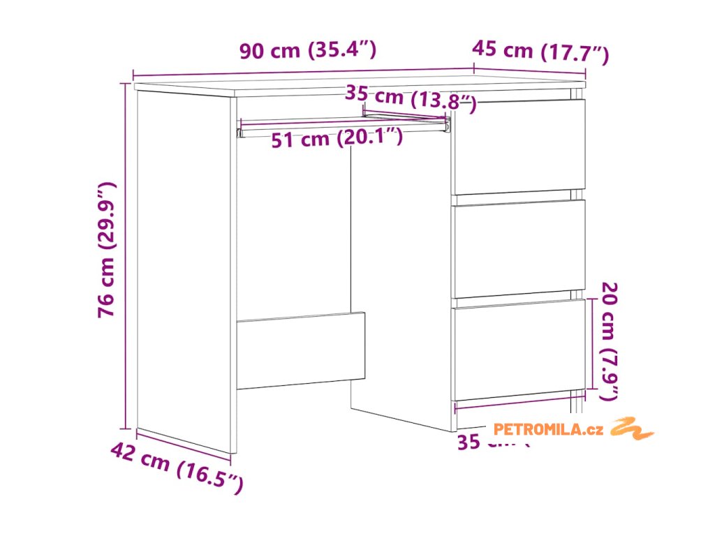 Psací stůl je vyrobený z kvalitního kompozitního dřeva, které mu zaručuje pevnost, dobrou odolnost a dlouhou životnost. Na délku měří 90 cm, nezabírá tedy příliš místa a hodí se do dětských nebo studentských pokojů. Můžete ho klidně postavit i do rohu. Design se zásuvkami rozšiřuje úložnou kapacitu stolu, takže si v něm můžete přehledně uspořádat různé složky, knihy a další potřeby. K čištění a údržbě vám postačí navlhčený hadřík.