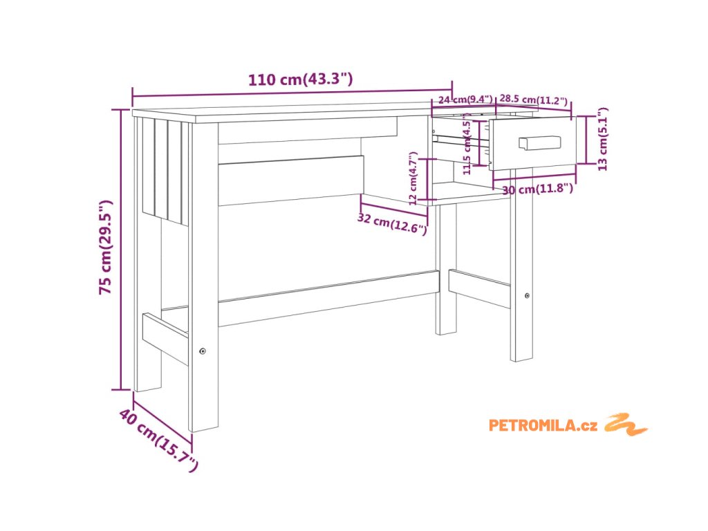 Psací stůl je zhotoven z masivního borového dřeva, je tedy stabilní a bytelný. Počítačový stůl má zásuvku a otevřenou přihrádku pro přehledné uložení vašich složek a dalších nezbytností domácí kanceláře, které potřebujete mít po ruce.
