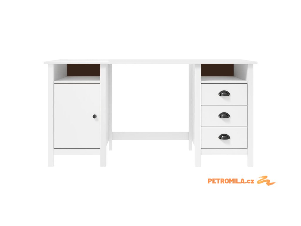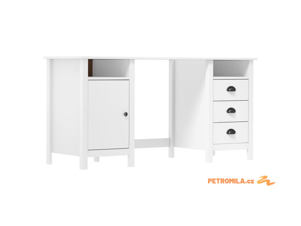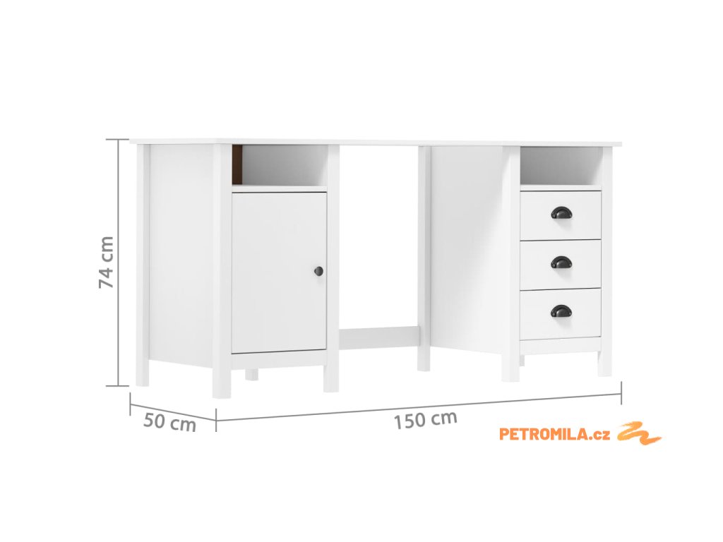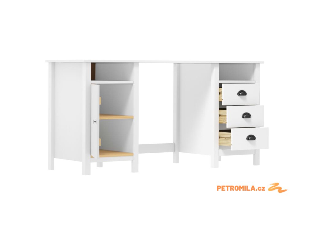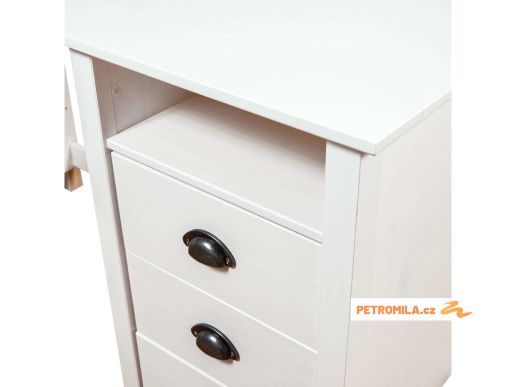 Psací stůl je zhotoven z masivního borového dřeva, je tedy stabilní a bytelný. Studijní stůl je vybaven 3 zásuvkami s úchytkami ve tvaru mušle, 2 přihrádkami a 1 dvířky. Poskytuje také dostatek úložného prostoru, takže si můžete vystavit nebo přehledně uložit jakékoli předměty.