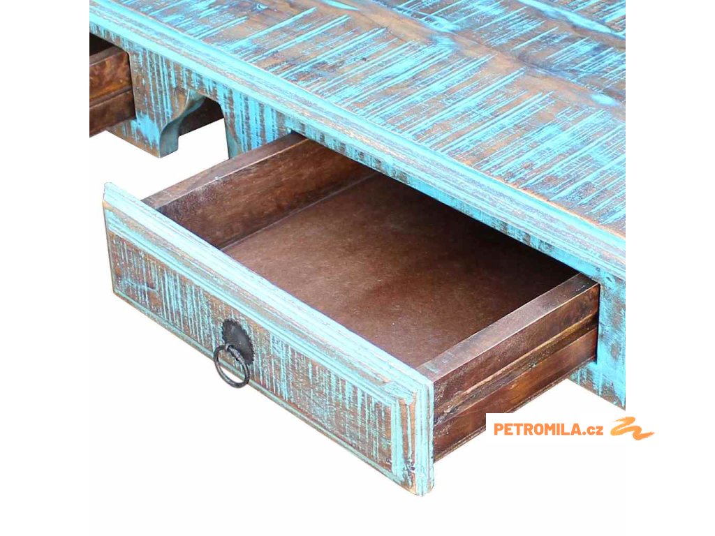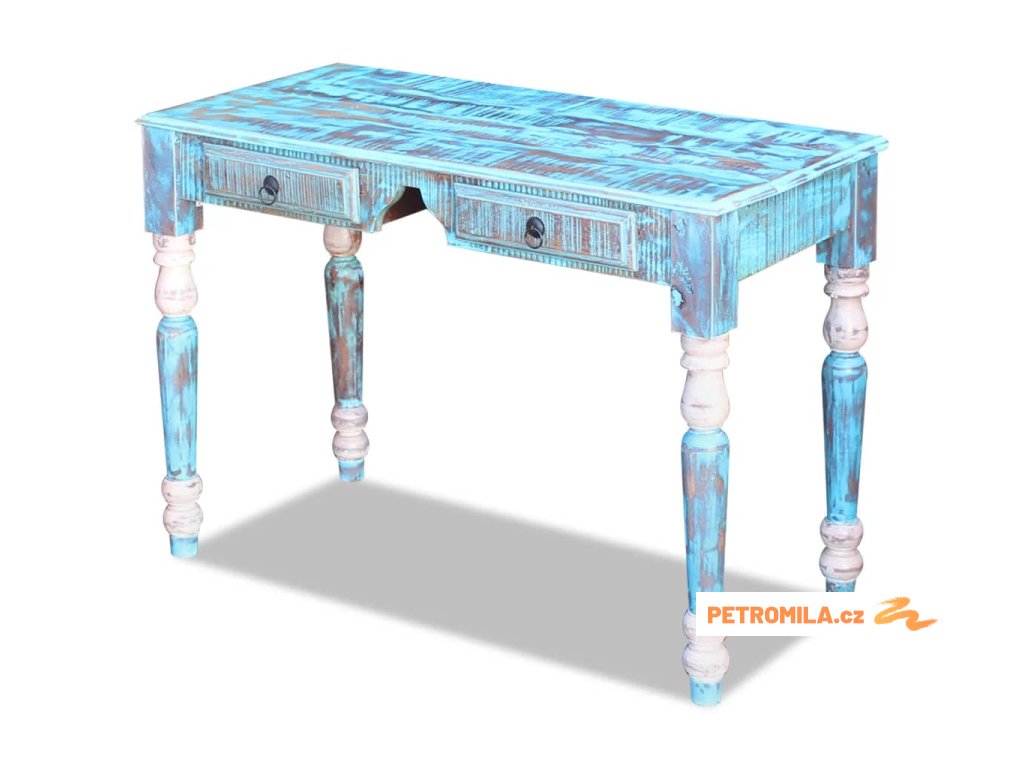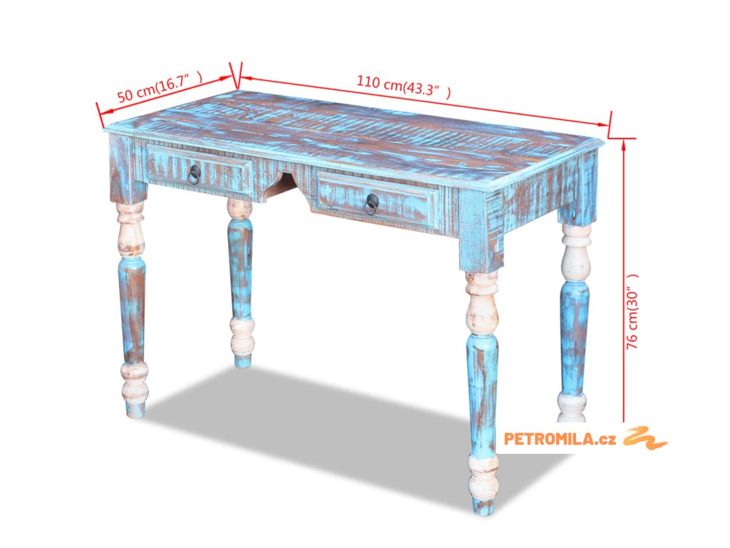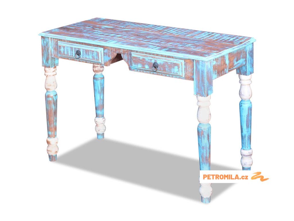 Tento dřevěný psací stůl ve vintage stylu, vyrobený z masivního recyklovaného dřeva, bude ve vaší domácnosti nadčasovým kusem nábytku. Stolní deska poskytuje stabilní a bezpečnou plochu k odkládání nápojů, košíků s ovocem, váz či dalších dekorativních předmětů. Jeho dvě zásuvky vám poskytnou spoustu místa na ukládání drobností, jako jsou klíče, poznámkové bloky a další maličkosti. Stůl se dá používat jako konzolový stolek, odkládací stůl, PC stůl, pracovní stůl, kancelářský stůl, stůl na čtení a studium apod.