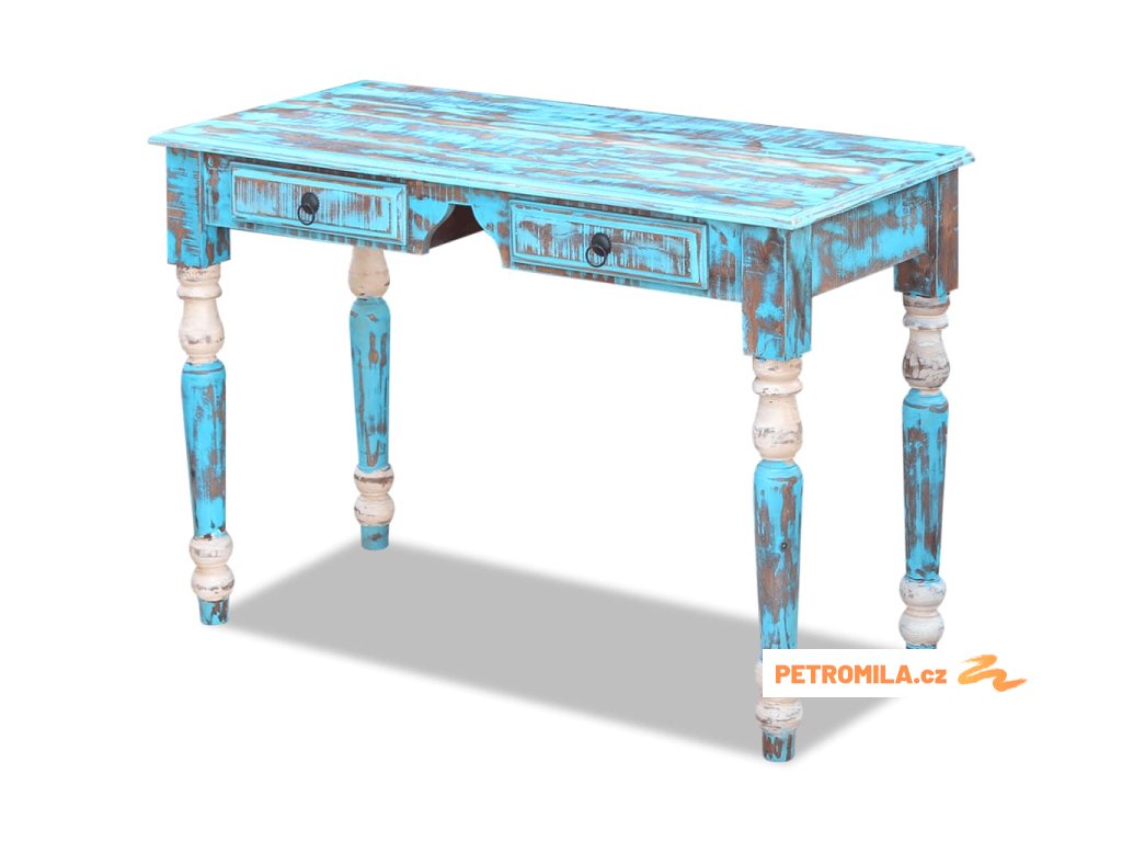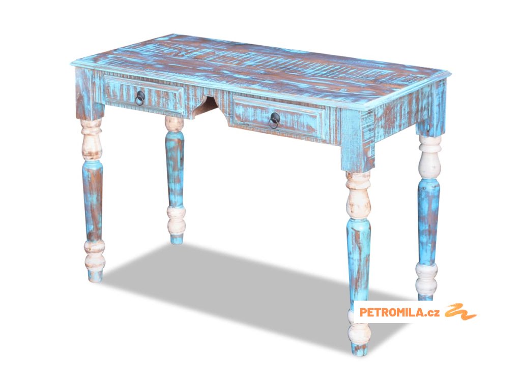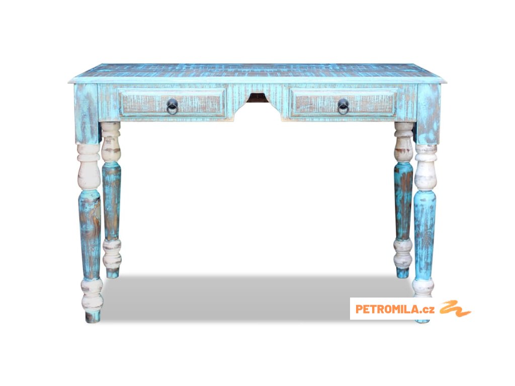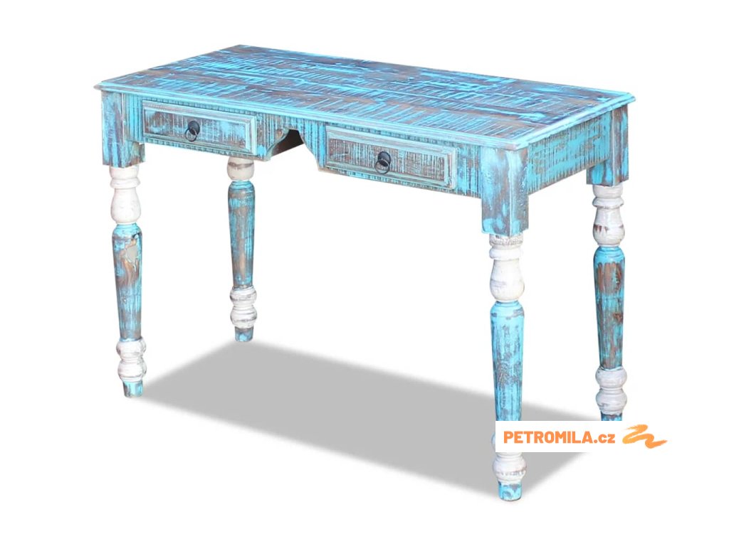 Tento dřevěný psací stůl ve vintage stylu, vyrobený z masivního recyklovaného dřeva, bude ve vaší domácnosti nadčasovým kusem nábytku. Stolní deska poskytuje stabilní a bezpečnou plochu k odkládání nápojů, košíků s ovocem, váz či dalších dekorativních předmětů. Jeho dvě zásuvky vám poskytnou spoustu místa na ukládání drobností, jako jsou klíče, poznámkové bloky a další maličkosti. Stůl se dá používat jako konzolový stolek, odkládací stůl, PC stůl, pracovní stůl, kancelářský stůl, stůl na čtení a studium apod.