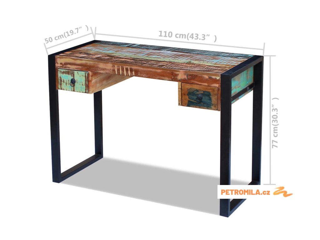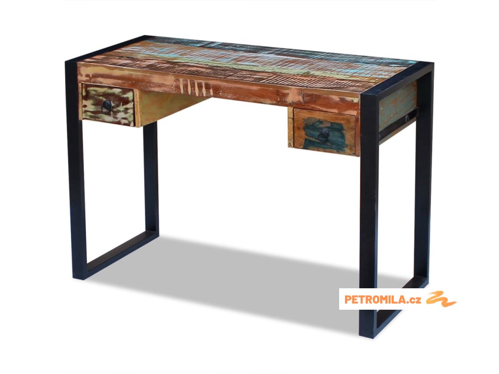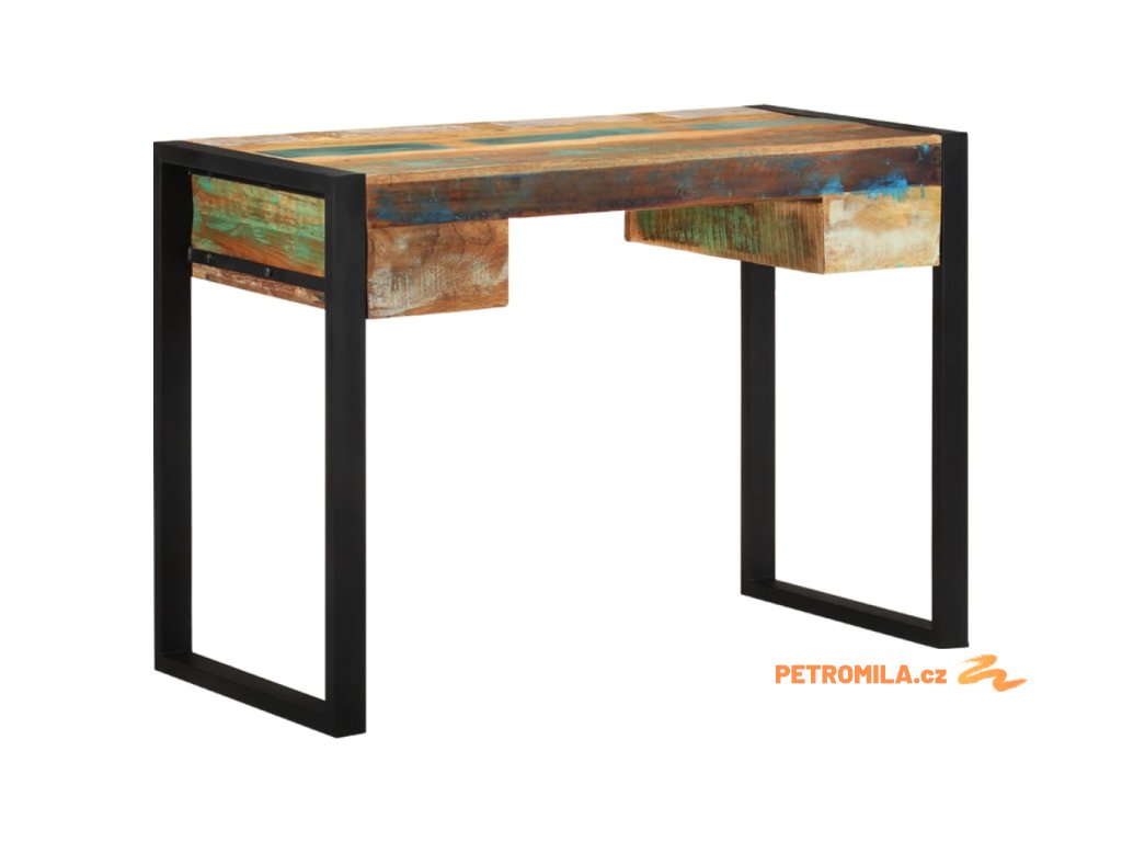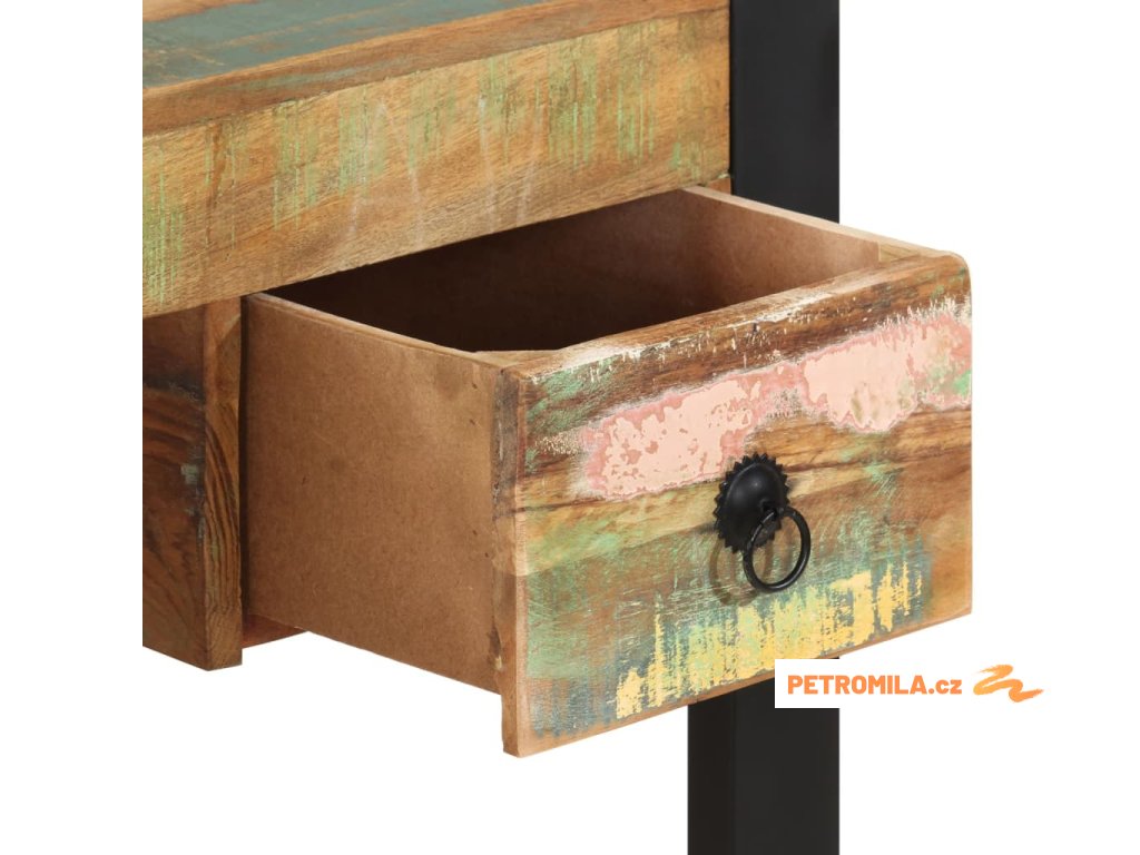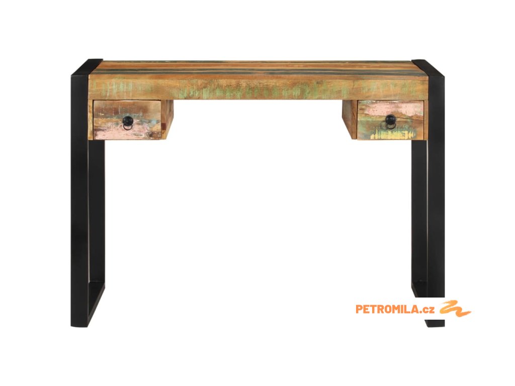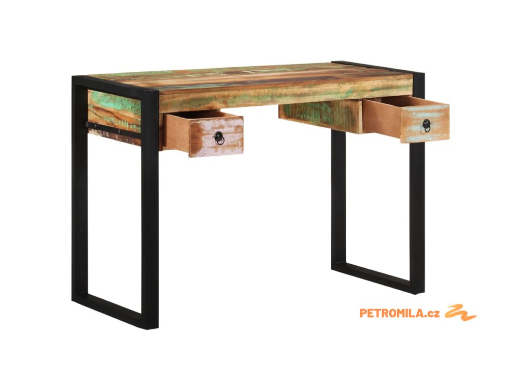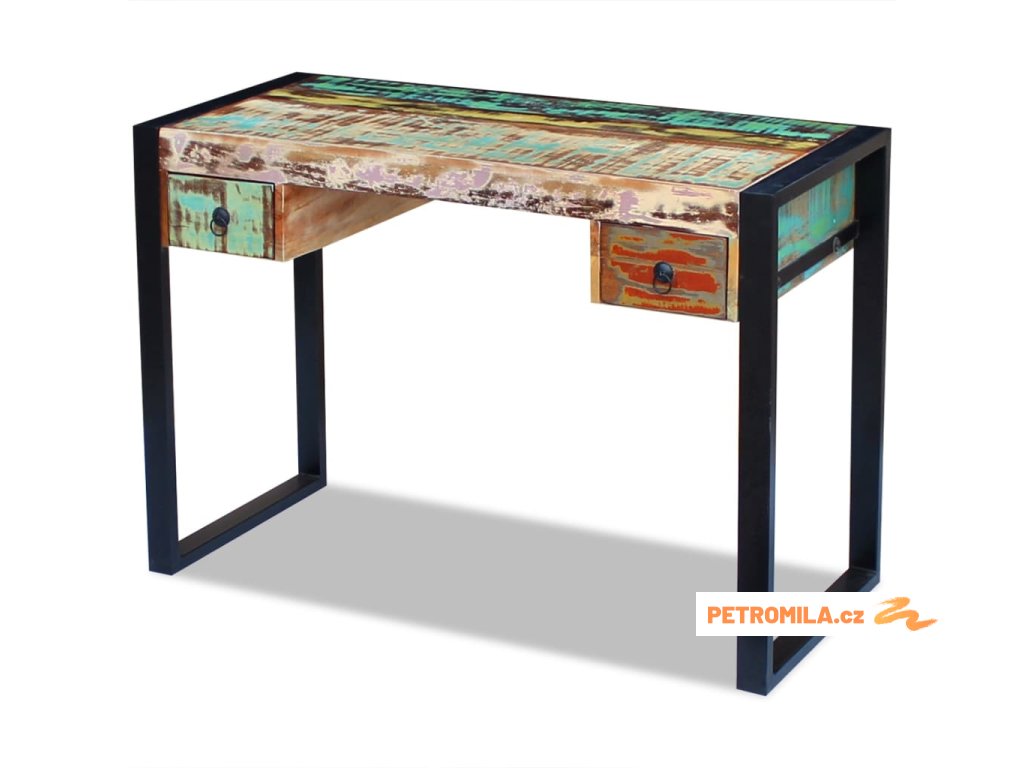 Tento dřevěný psací stůl ve vintage stylu, vyrobený z masivního recyklovaného dřeva, bude ve vaší domácnosti nadčasovým kusem nábytku. Díky svému pevnému ocelovému rámu je tento stůl velmi stabilní a odolný. Stolní deska poskytuje stabilní a bezpečnou plochu k odkládání nápojů, košíků s ovocem, váz či dalších dekorativních předmětů. Jeho dvě zásuvky vám poskytnou spoustu místa na ukládání drobností, jako jsou klíče, poznámkové bloky a další maličkosti. Stůl se dá používat jako PC stůl, pracovní stůl, kancelářský stůl, stůl na čtení a studium apod. Můžete ho používat také jako odkládací nebo konzolový stolek.