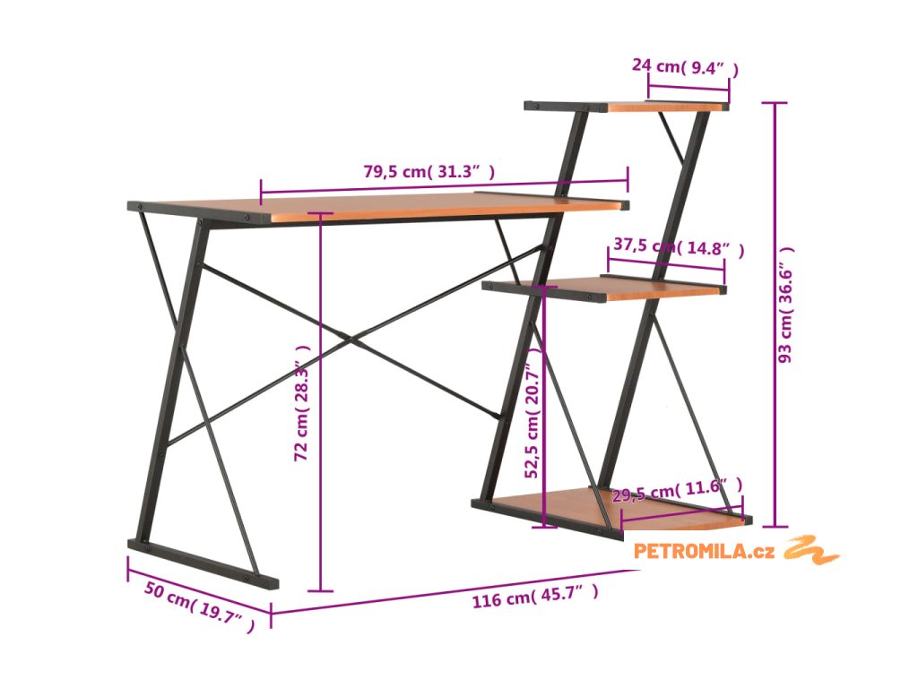 Tento jedinečný a elegantní stolek má prostorné a robustní regály. Velká stolní deska je ideální pro umístění počítače a příslušenství, takže je skvělým pracovním místem pro papírování, kancelářské práce a studium, zatímco integrované police poskytují další úložný a odkládací prostor pro vaše knihy, složky, dokumenty nebo zarámované fotografie, ozdobné předměty, rostliny atd.