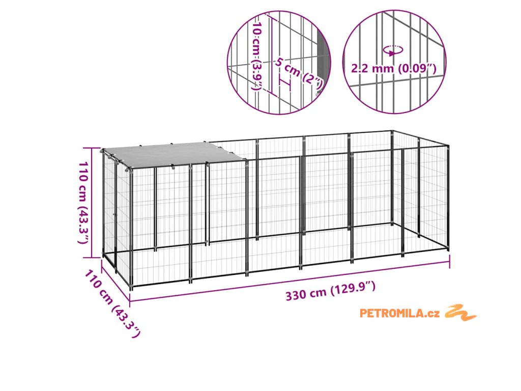 Psí kotec černý 330 x 110 x 110 cm ocel