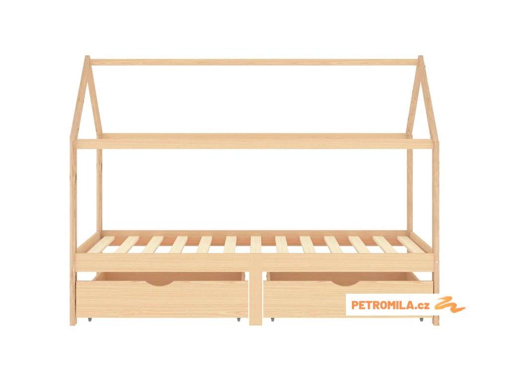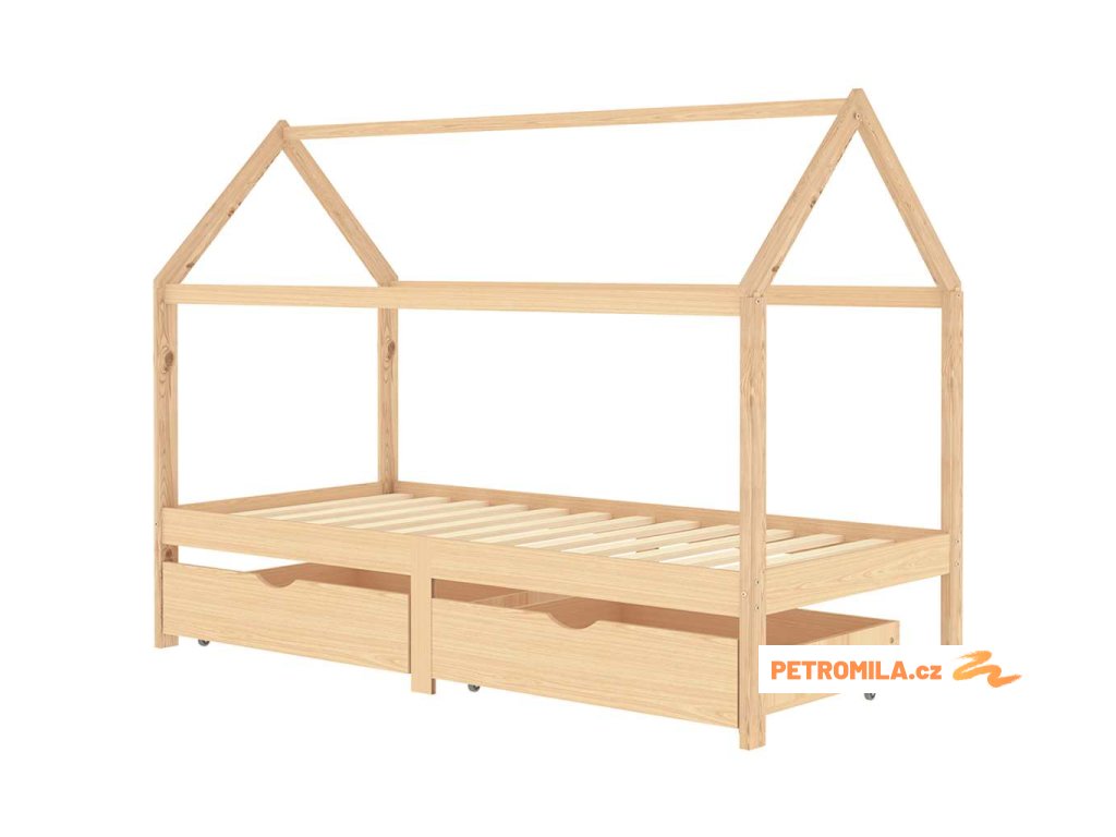 Postel je chytře navržená ve stylu domku na stromě. Chcete-li svému dítěti dopřát trochu soukromí, můžete mu na rám pověsit závěsy. Domeček mu kromě toho skvěle poslouží i jako koutek pro čtení nebo hraní. Rám postele je vyrobený z masivního borového dřeva, je tudíž mimořádně odolný a má dlouhou životnost. Pevné lamely nabízejí potřebnou oporu a zároveň jsou velmi pohodlné. Postel je vybavená zásuvkami, které poskytují dostatek úložného prostoru pro uschování složeného oblečení, hraček apod. Udržuje tak dětský pokoj čistý a uklizený. Kolečka se snadno pohybují na kobercích i dřevěných podlahách. Tento rám postele je vhodný pro matraci o rozměrech 90 x 200 cm.