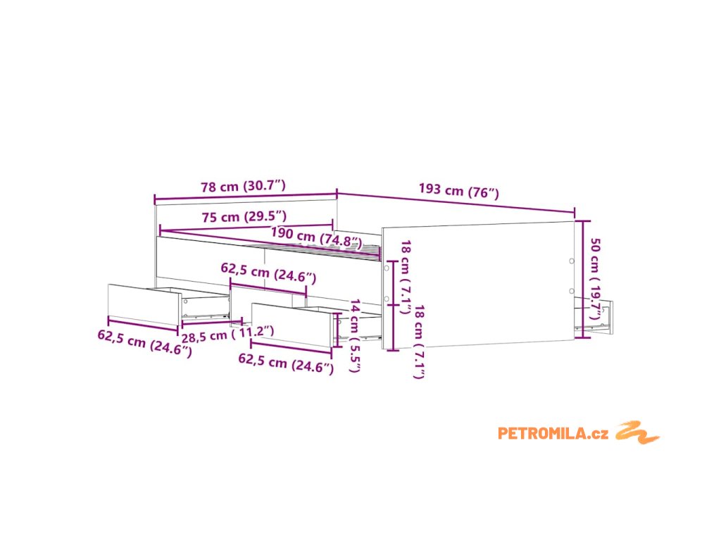 - Celkové rozměry: 193 x 78 x 50 cm (D x Š x V)