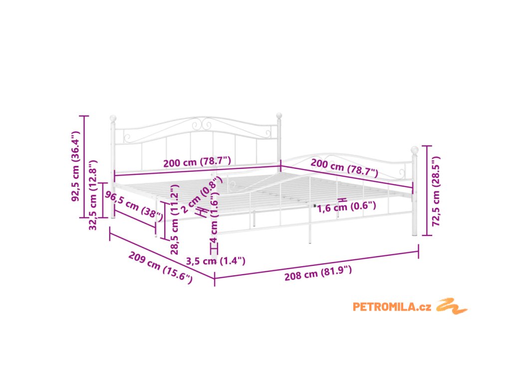 Rám postele bílý kov 200 x 200 cm
