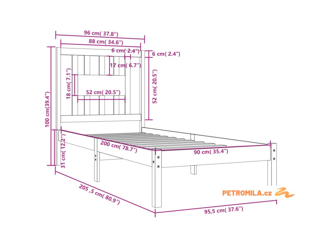 - Rozměry čela postele: 96 x 4 x 100 cm (D x Š x V)