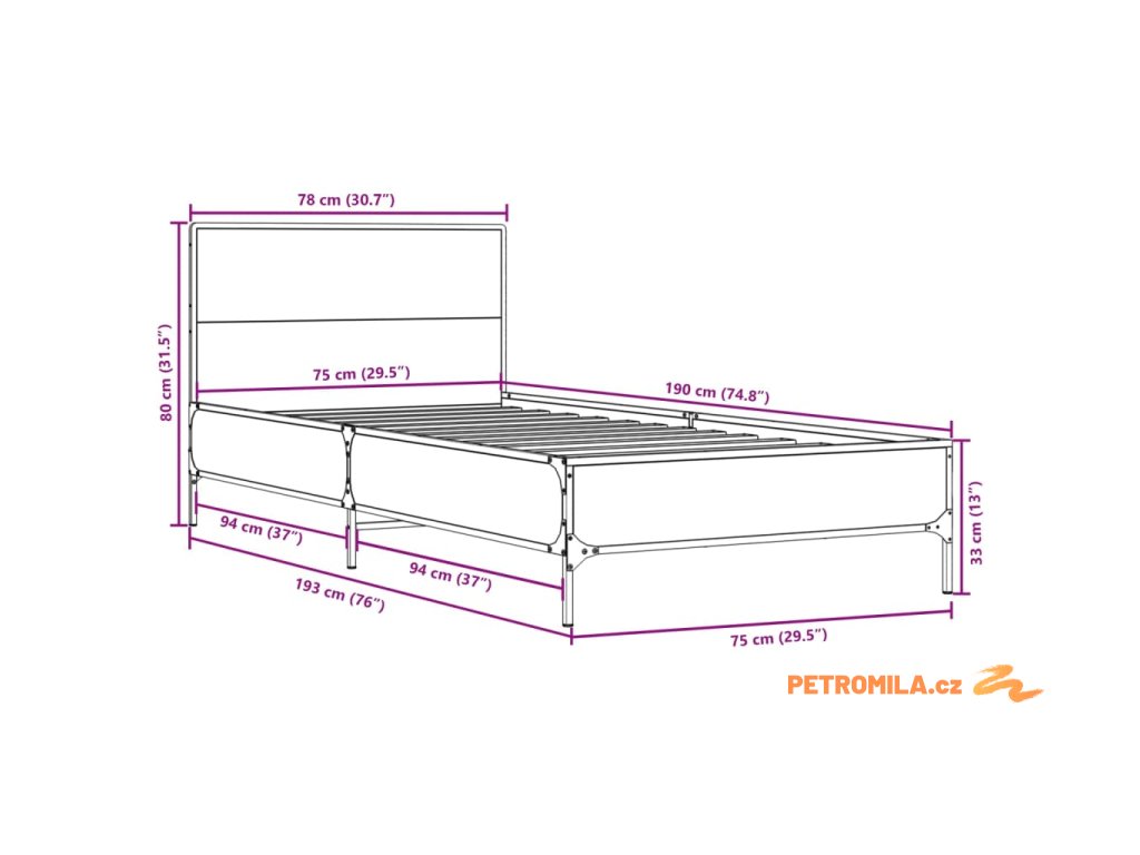 Rám postele kouřový dub 75 x 190 cm kompozitní dřevo a kov