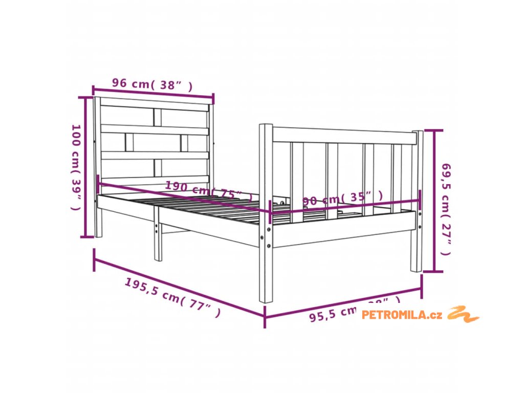 - Rozměry rámu postele: 195,5 x 95,5 x 69,5 cm (D x Š x V)