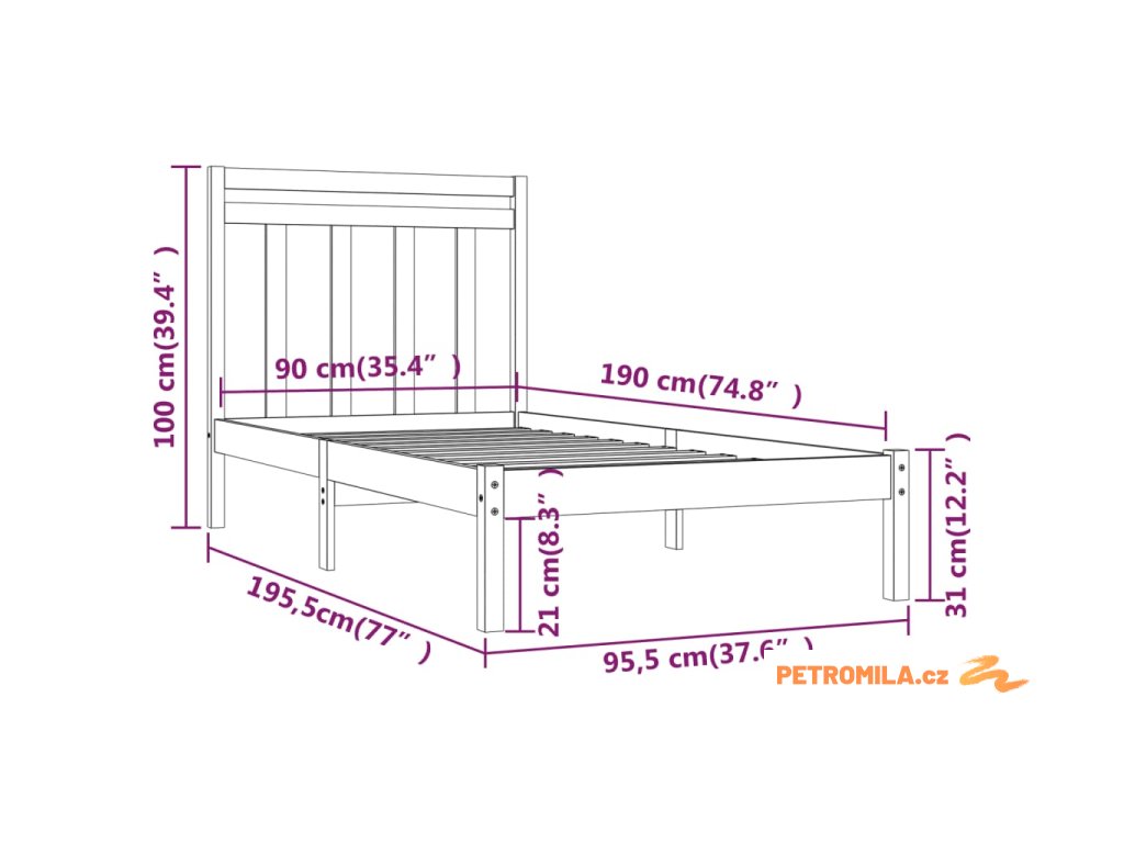 - Rozměry rámu postele: 195,5 x 95,5 x 31 cm (D x Š x V)