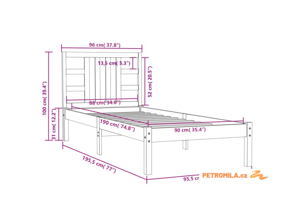 - Rozměry rámu postele: 195,5 x 95,5 x 31 cm (D x Š x V)