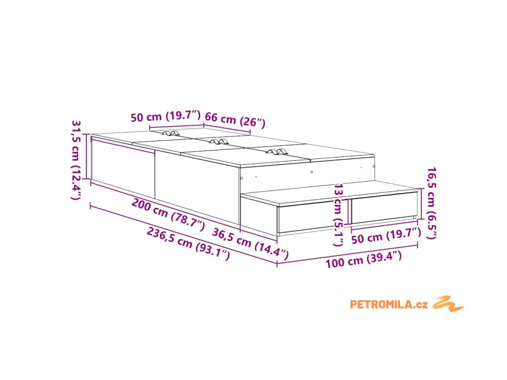 - Celkové rozměry: 236,5 x 100 x 31,5 cm (D x Š x V)