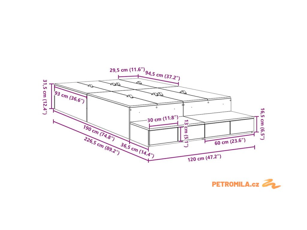 - Celkové rozměry: 226,5 x 120 x 31,5 cm (D x Š x V)