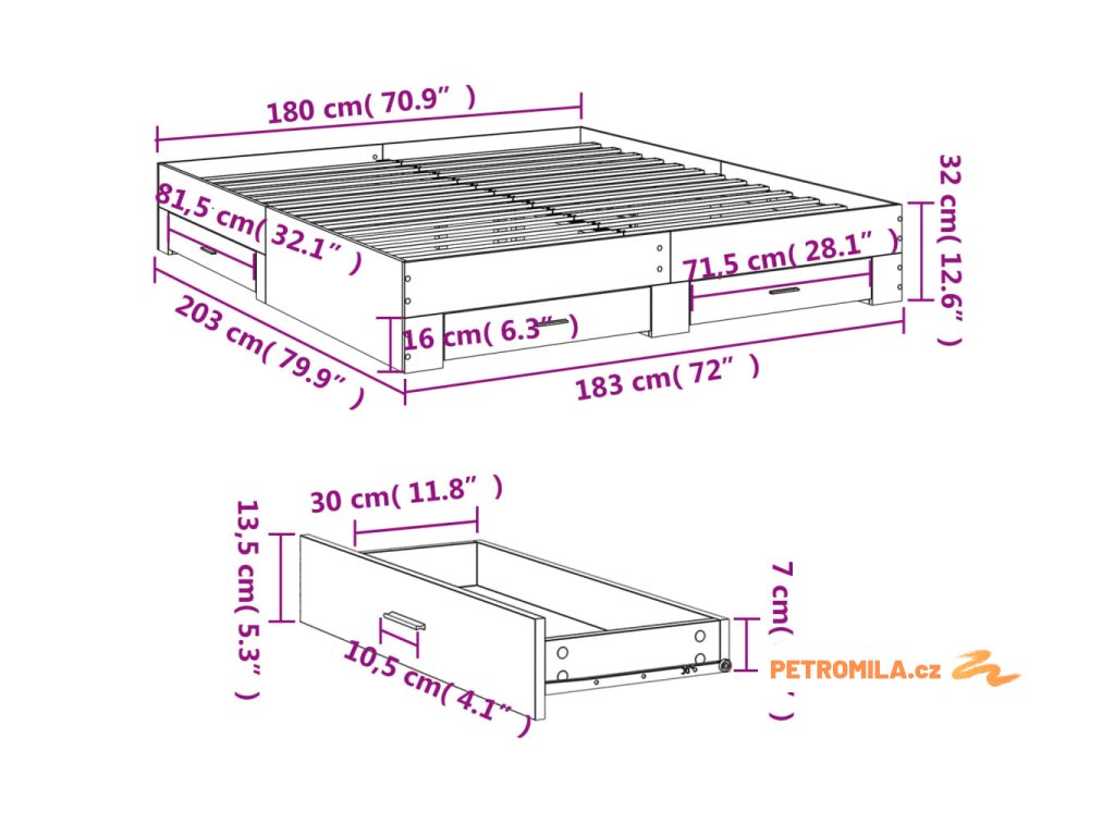 - Rozměry zásuvky postele (S): 71,5 x 31,5 x 13,5 cm (D x Š x V)