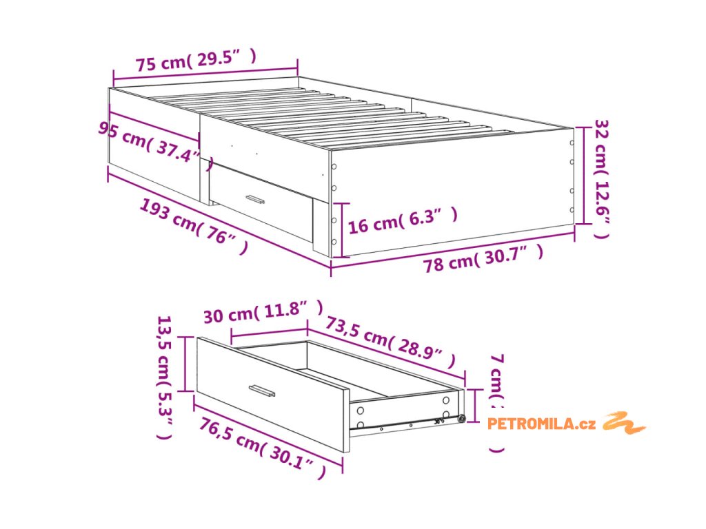 - Rozměry zásuvky pod postel (každá): 76,5 x 31,5 x 13,5 cm (D x Š x V)