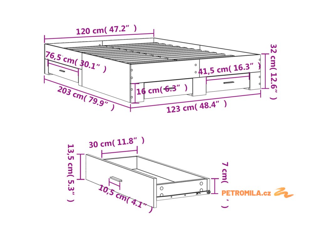 • Rozměry zásuvky postele (S): 41,5 x 31,5 x 13,5 cm (D x Š x V)