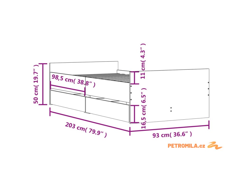 - Rozměry zásuvky (každá): 98,5 x 43 x 16,5 cm (D x Š x V)