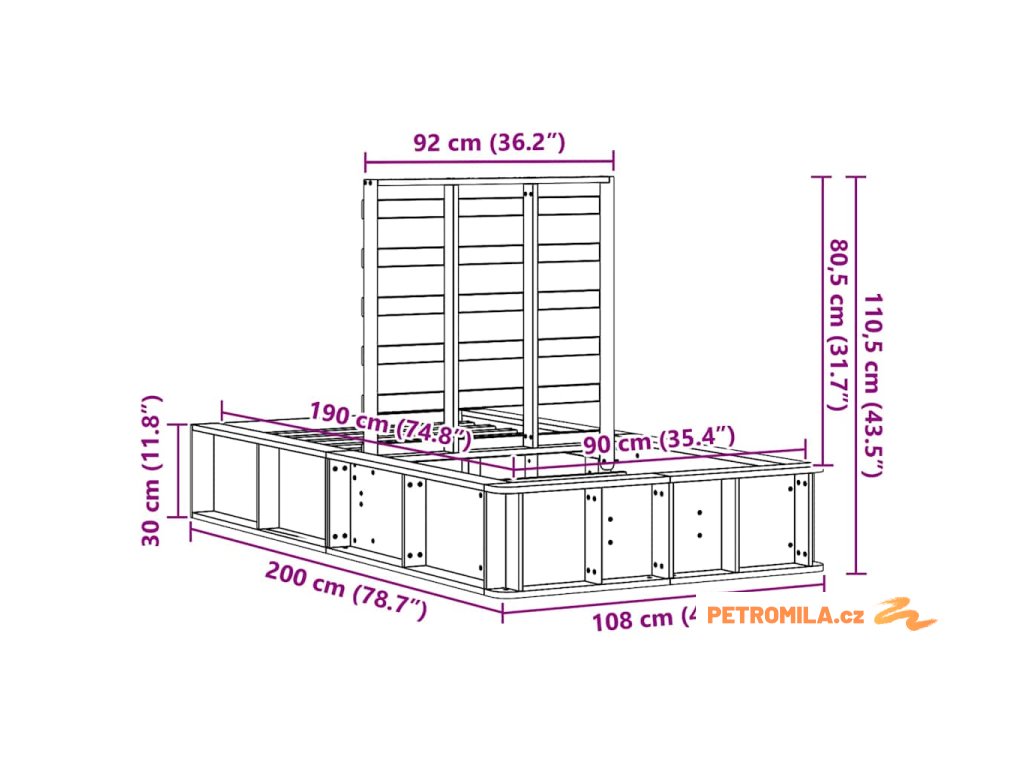 - Celkové rozměry: 200 x 108 x 30 cm (D x Š x V)