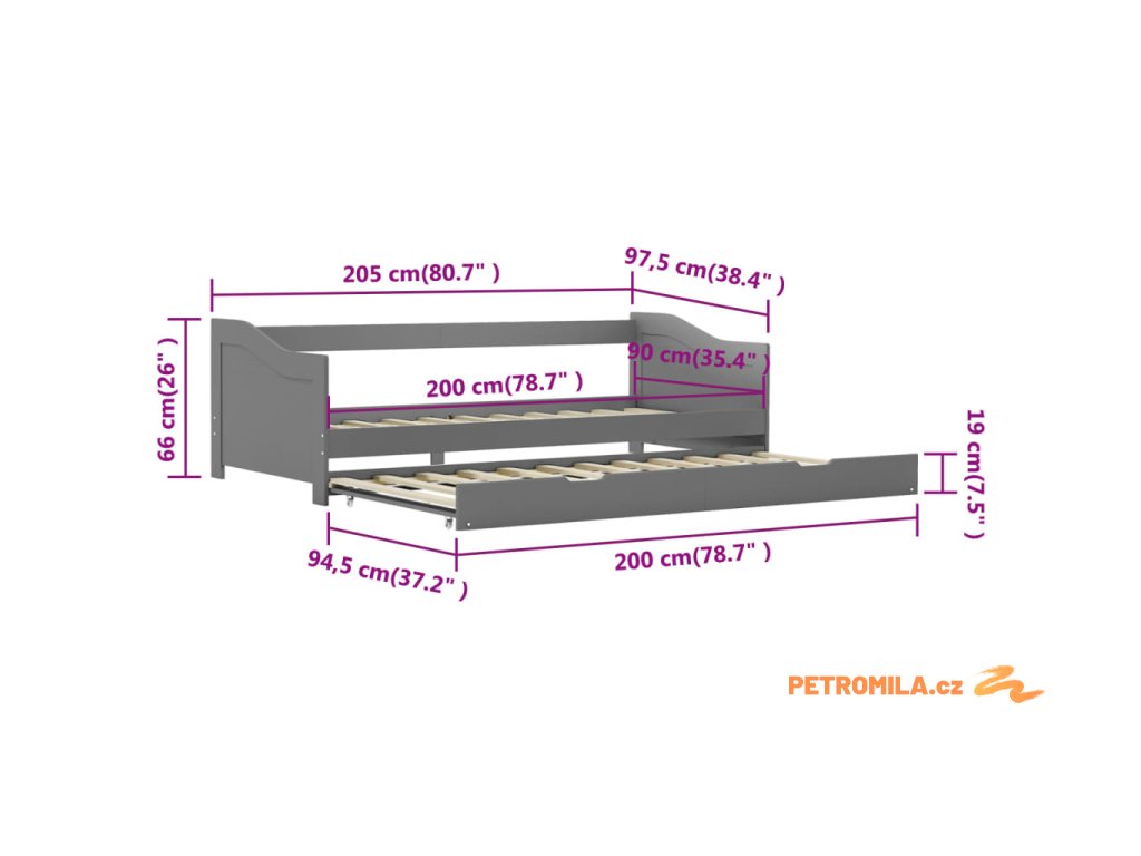 Rám vysouvací postele/pohovky šedý borové dřevo 90 x 200 cm