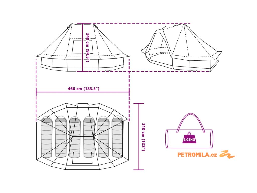 - Celkové rozměry: 466 x 310 x 240 cm (D x Š x V)
