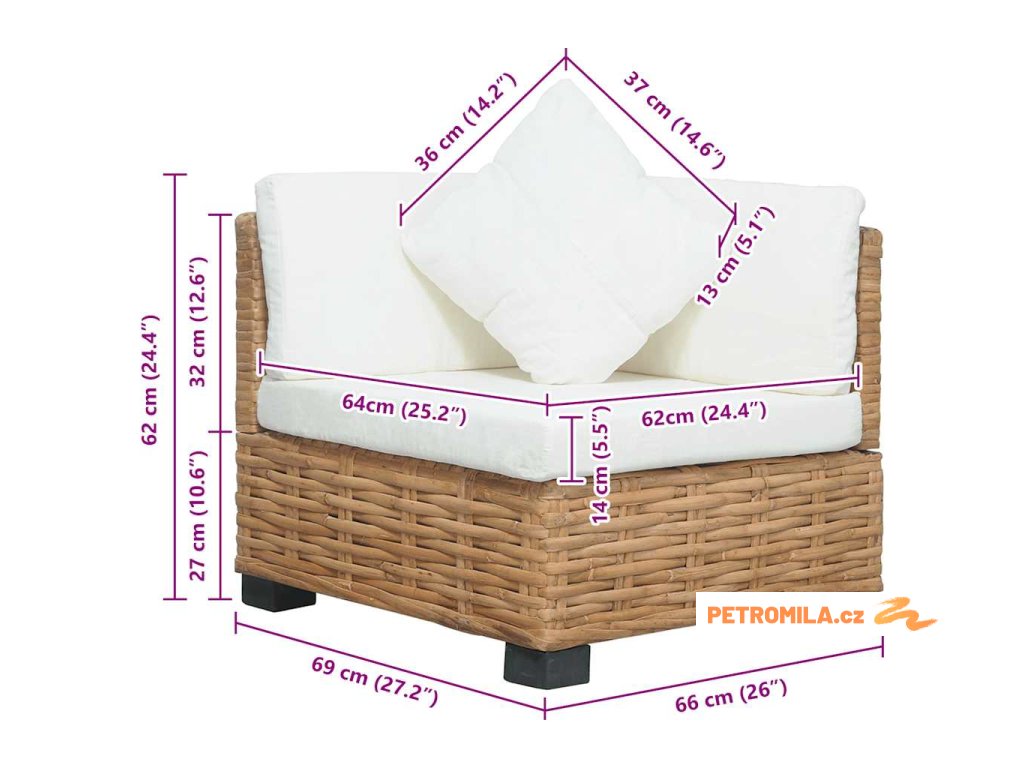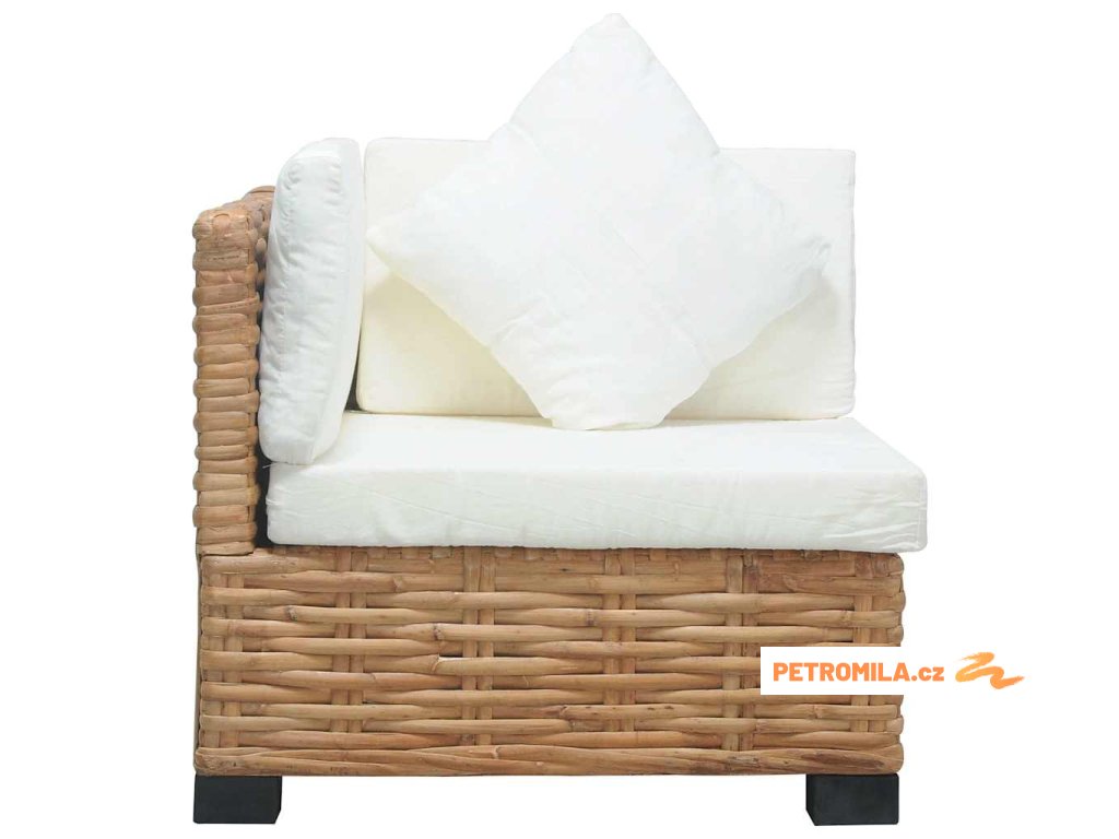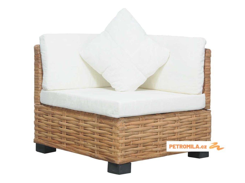 Tato pohovka je pokrytá přírodním ratanem, který nejenže dobře vypadá, ale je také velmi odolný. Ratan má líbivý přirozený vzhled a je příjemný na dotek. Nohy pohovky jsou vyrobené z mahagonového a mangovníkového dřeva, velmi tvrdého a stabilního materiálu. Pohodlné podušky poskytují komfort a vytváří útulnou atmosféru. Rohová pohovka se snadno sestavuje. Součástí balení je 1 rohová pohovka, 1 poduška na sedák, 1 poduška pod záda a 1 polštář.