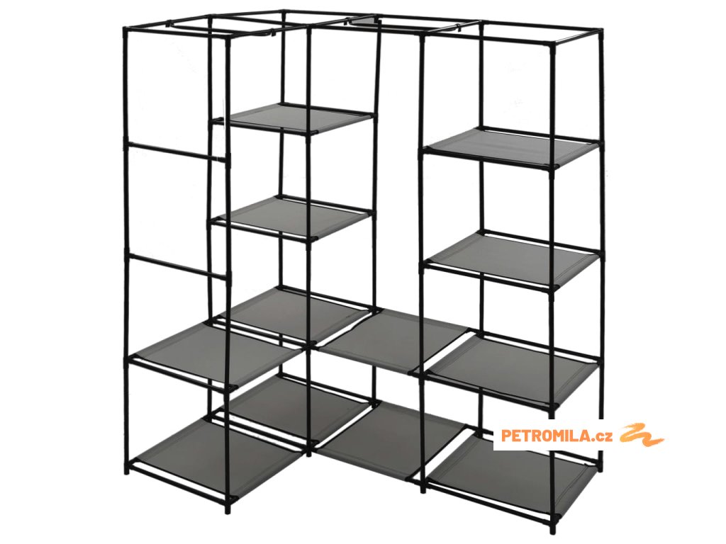 Tento stojan na oblečení s robustním železným rámem je mimořádně odolný. Ve srovnání s běžnou látkovou skříní je konstrukce rohové látkové skříně ještě stabilnější. Její design také šetří místo a umožňuje využít roh místnosti a vytvořit zde úložný prostor s tyčemi pro zavěšení, kde si můžete uspořádat vaše tašky, boty a malé předměty na dosah ruky. Textilní potah se zipy chrání vaše oblečení před nečistotami a prachem.