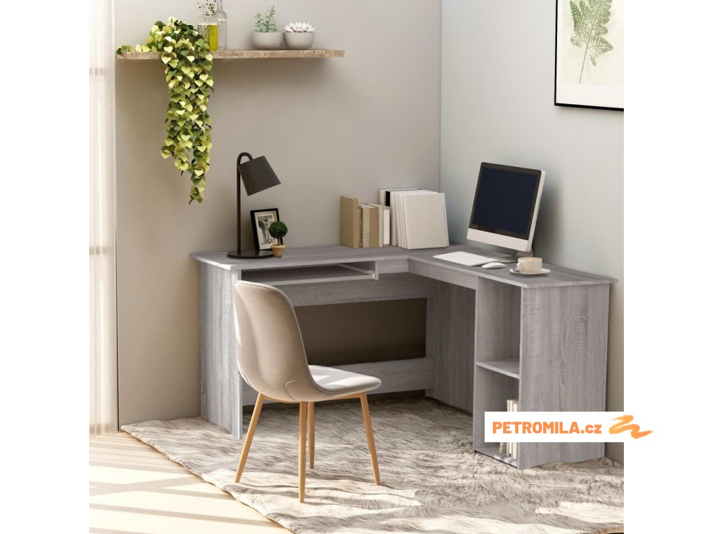 Tento moderní rohový psací stůl ve tvaru písmene L je navržený s výsuvnou deskou na klávesnici a 2 otevřenými policemi, takže je velmi praktický a stane se skvělým doplňkem vašeho studijního y pracovního prostoru!