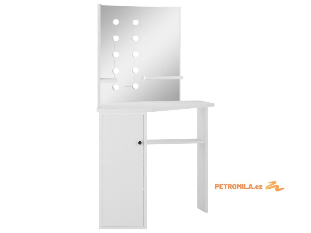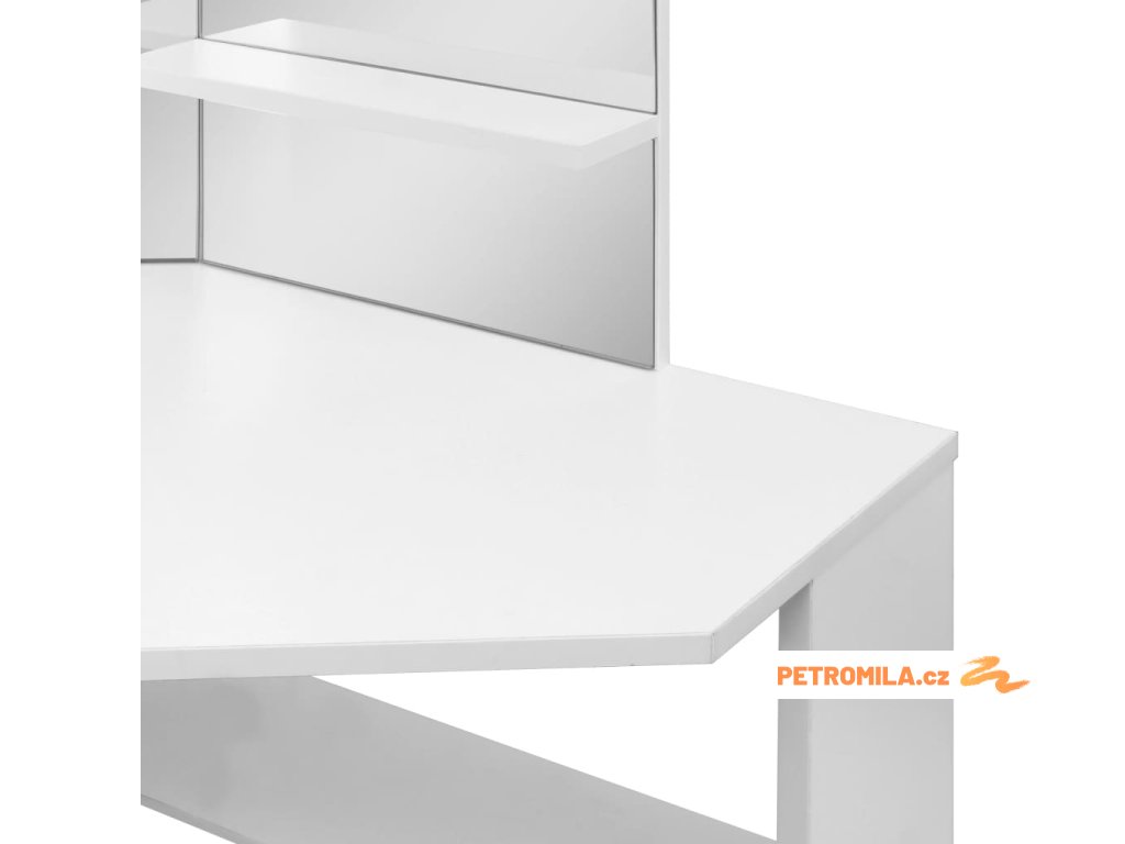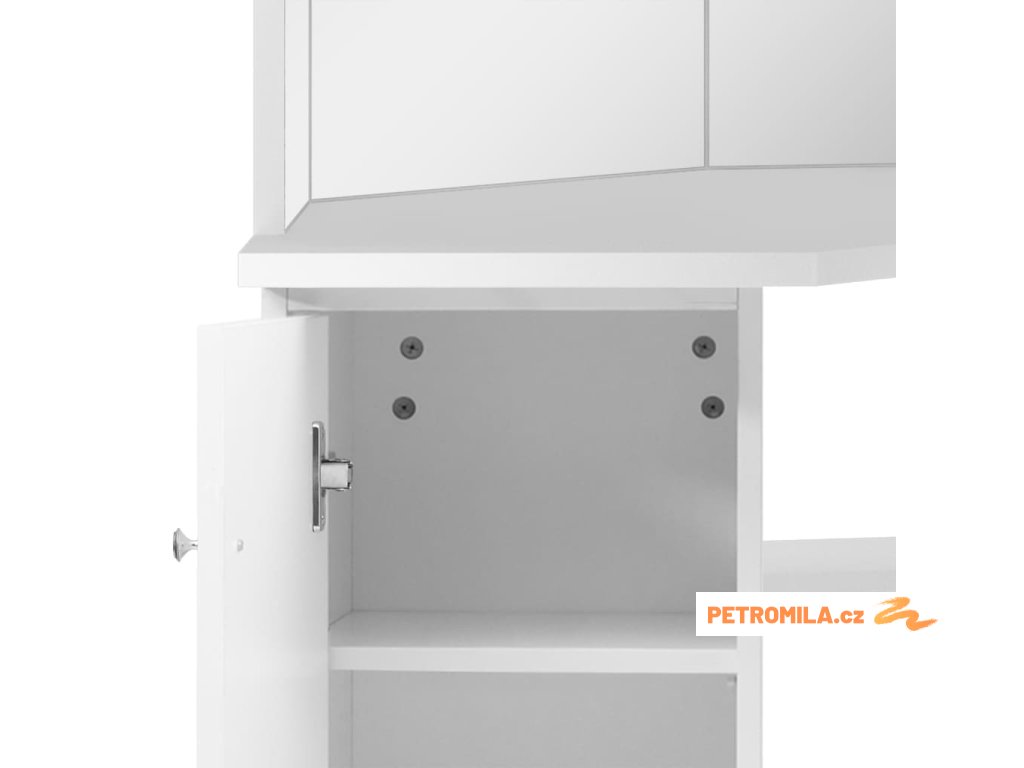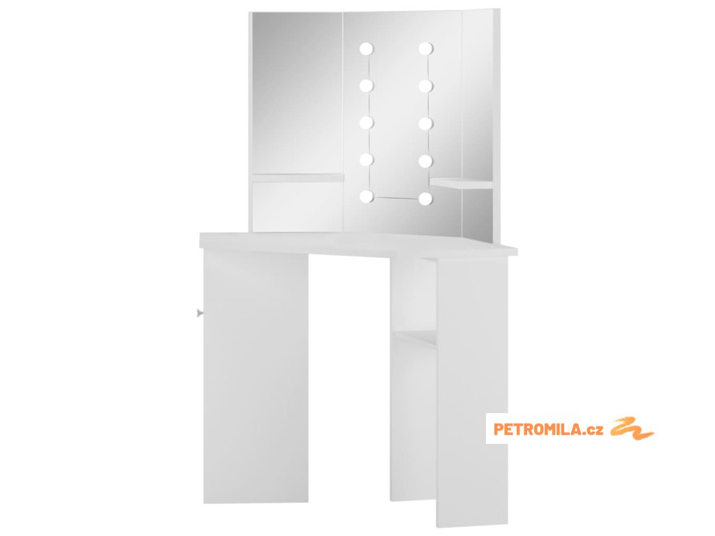 Tento toaletní stolek, vyrobený z kvalitního MDF, zaujme elegantní siluetou a jednoduchými liniemi v moderním stylu. Je navržen tak, aby se pohodlně vešel do rohu a zároveň nabídl na malém místě spoustu úložného místa! Prostorná skříňka a otevřená police pod stolní deskou slouží k přehlednému uložení líčení a kosmetiky, a jelikož jsou otevřené do stran, máte k nim snadný přístup, zatímco jste usazení u stolu. Krásné 3panelové zrcadlo vás odráží ze 3 stran, takže vám usnadňuje aplikaci make-upu a zároveň dodává stolu elegantní vzhled. Ke dvěma panelům jsou přidané spodní police na lahvičky, štětce na líčení, krémy a lotions, parfémy a dekorativní předměty. Elegantní LED žárovky vám poskytnou optimální osvětlení.