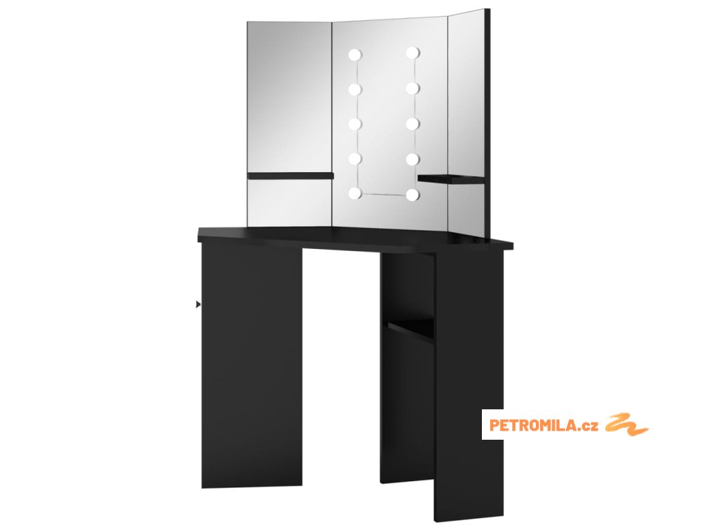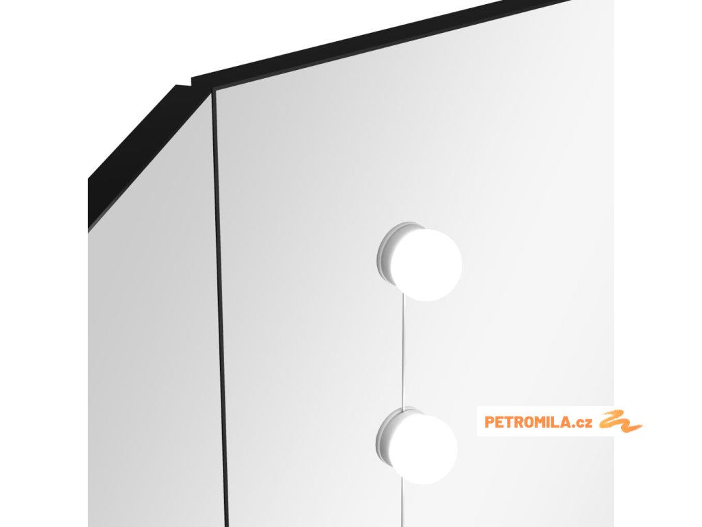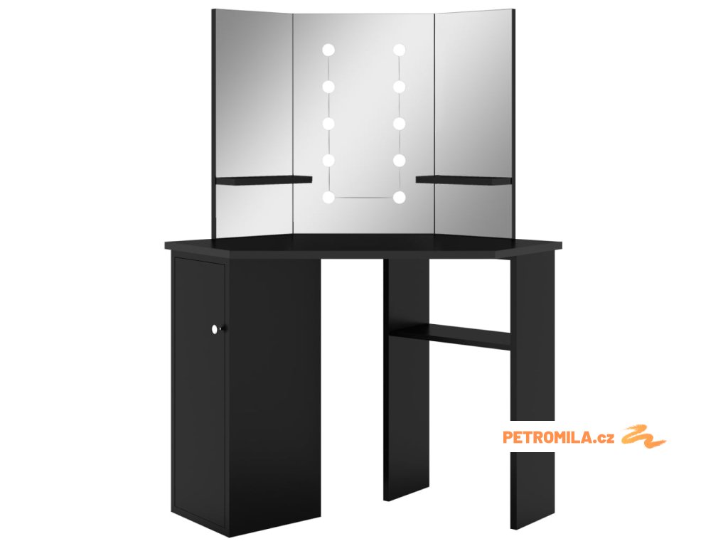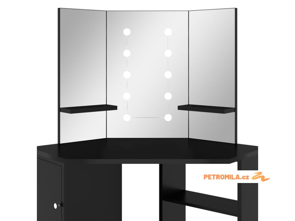 Tento toaletní stolek, vyrobený z kvalitního MDF, zaujme elegantní siluetou a jednoduchými liniemi v moderním stylu. Je navržen tak, aby se pohodlně vešel do rohu a zároveň nabídl na malém místě spoustu úložného místa! Prostorná skříňka a otevřená police pod stolní deskou slouží k přehlednému uložení líčení a kosmetiky, a jelikož jsou otevřené do stran, máte k nim snadný přístup, zatímco jste usazení u stolu. Krásné 3panelové zrcadlo vás odráží ze 3 stran, takže vám usnadňuje aplikaci make-upu a zároveň dodává stolu elegantní vzhled. Ke dvěma panelům jsou přidané spodní police na lahvičky, štětce na líčení, krémy a lotions, parfémy a dekorativní předměty. Elegantní LED žárovky vám poskytnou optimální osvětlení.