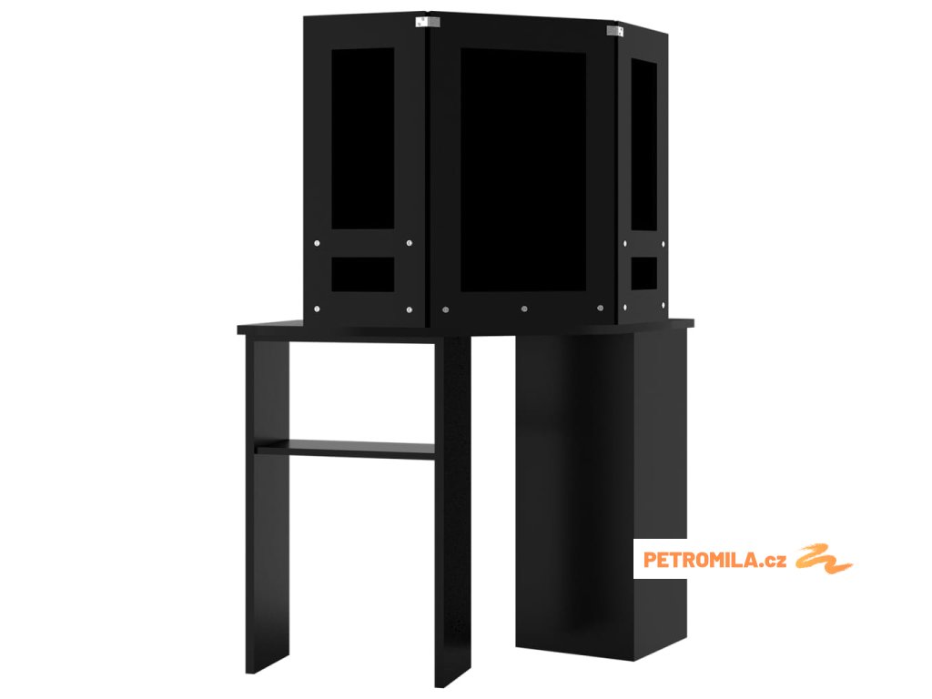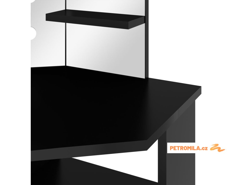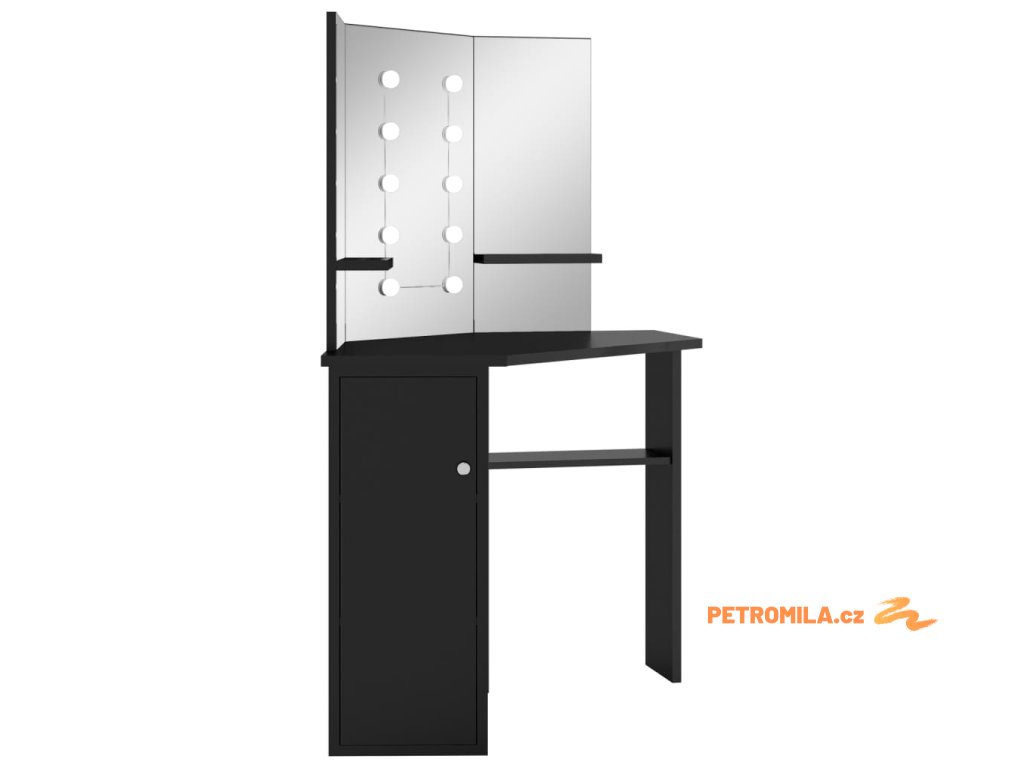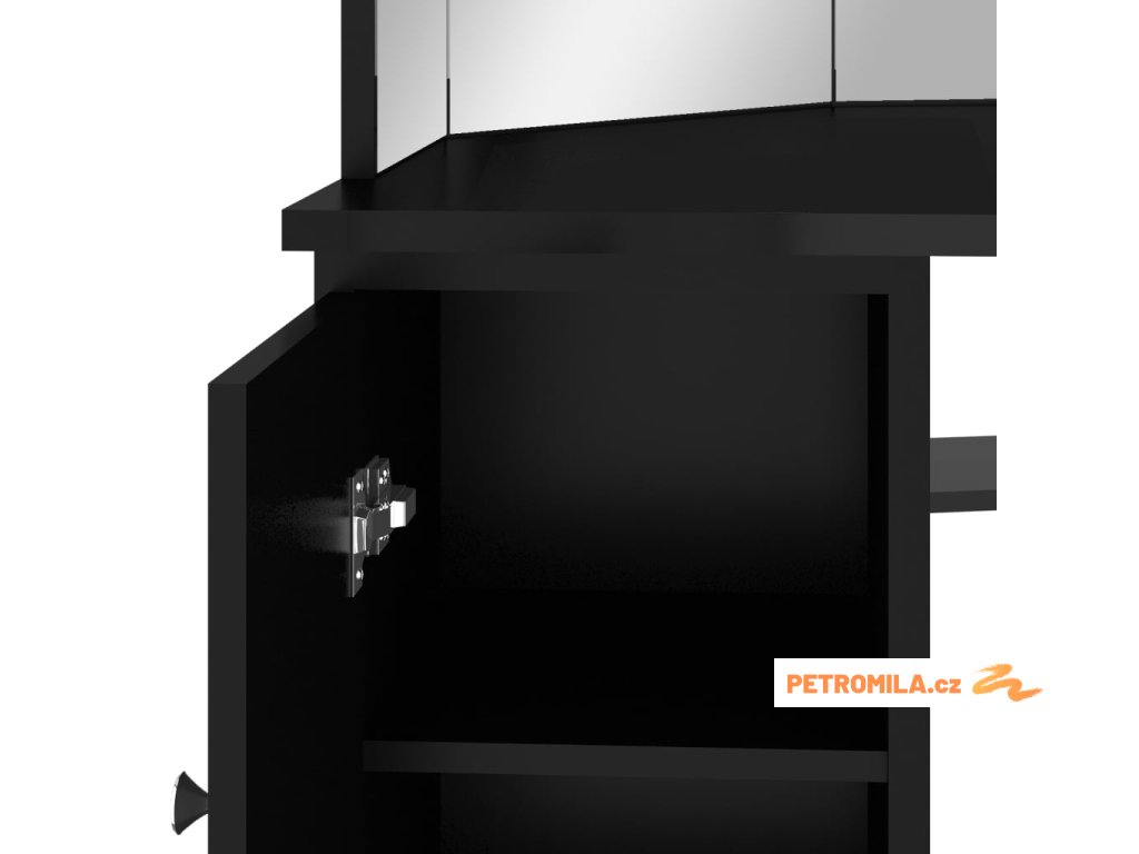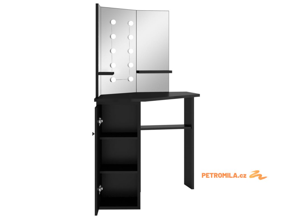 Tento toaletní stolek, vyrobený z kvalitního MDF, zaujme elegantní siluetou a jednoduchými liniemi v moderním stylu. Je navržen tak, aby se pohodlně vešel do rohu a zároveň nabídl na malém místě spoustu úložného místa! Prostorná skříňka a otevřená police pod stolní deskou slouží k přehlednému uložení líčení a kosmetiky, a jelikož jsou otevřené do stran, máte k nim snadný přístup, zatímco jste usazení u stolu. Krásné 3panelové zrcadlo vás odráží ze 3 stran, takže vám usnadňuje aplikaci make-upu a zároveň dodává stolu elegantní vzhled. Ke dvěma panelům jsou přidané spodní police na lahvičky, štětce na líčení, krémy a lotions, parfémy a dekorativní předměty. Elegantní LED žárovky vám poskytnou optimální osvětlení.