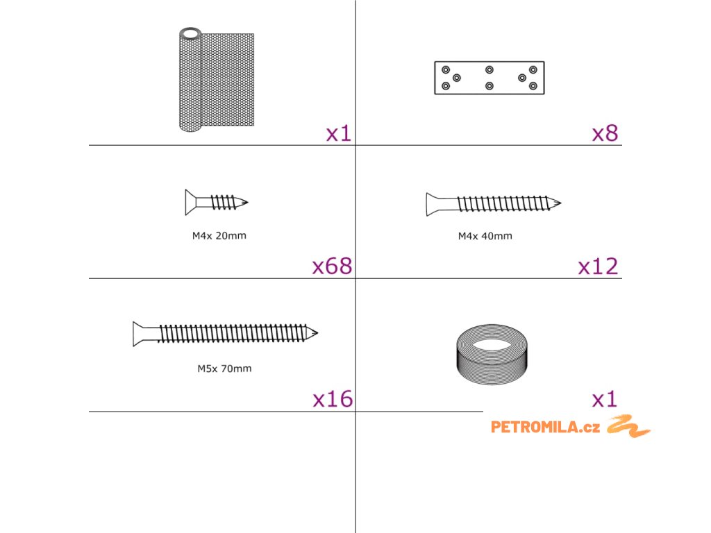 - Dodávka obsahuje pouze roli drátěného pletiva, vázací drát, ploché spojky a vruty do dřeva.