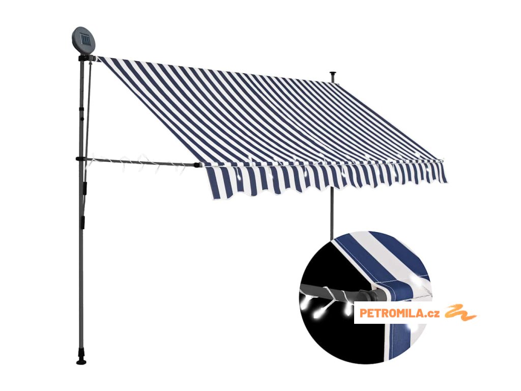 Ručně zatahovací markýza s LED světlem 250 cm modrobílá
