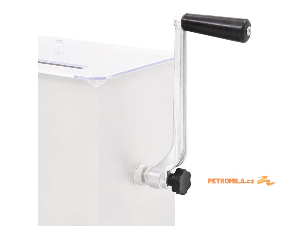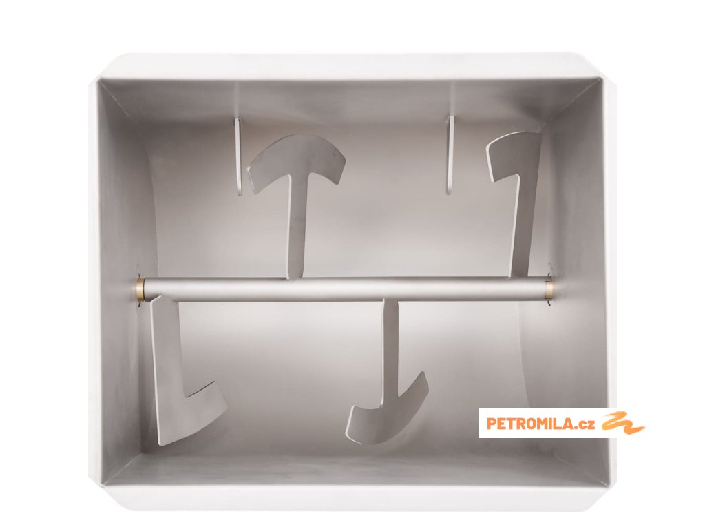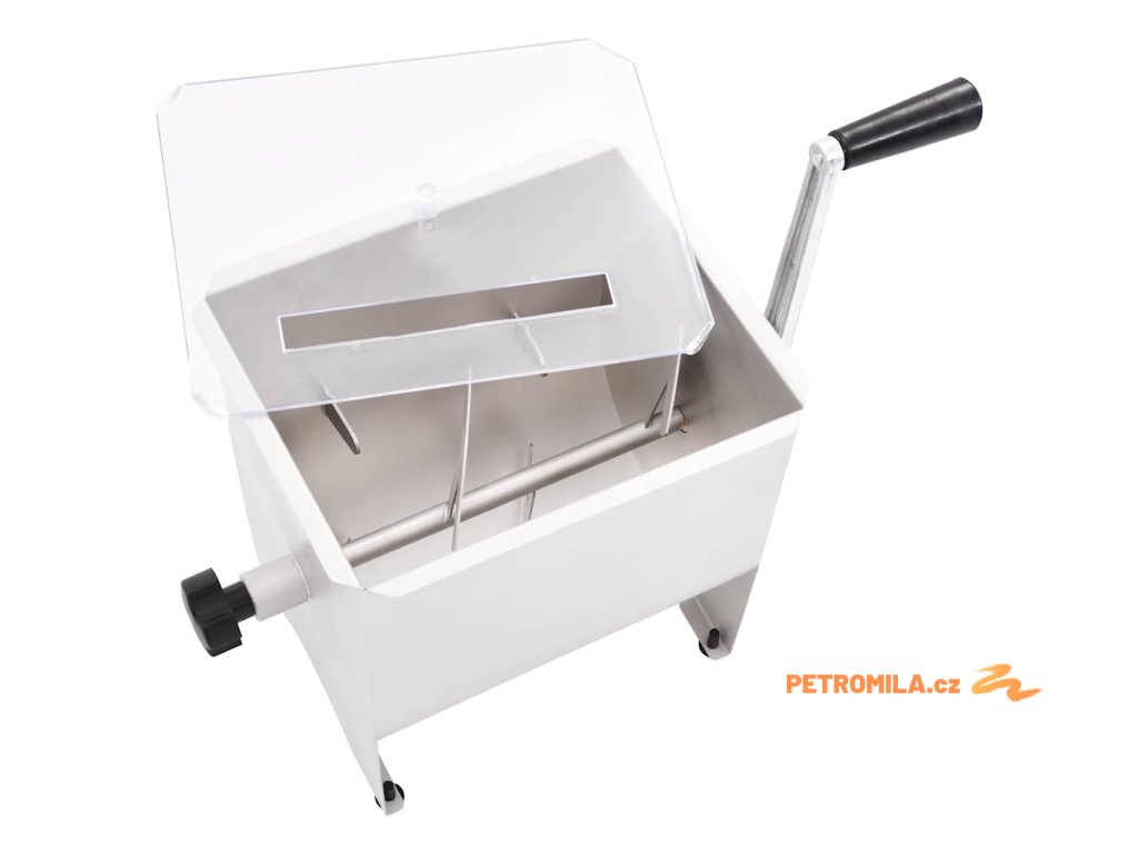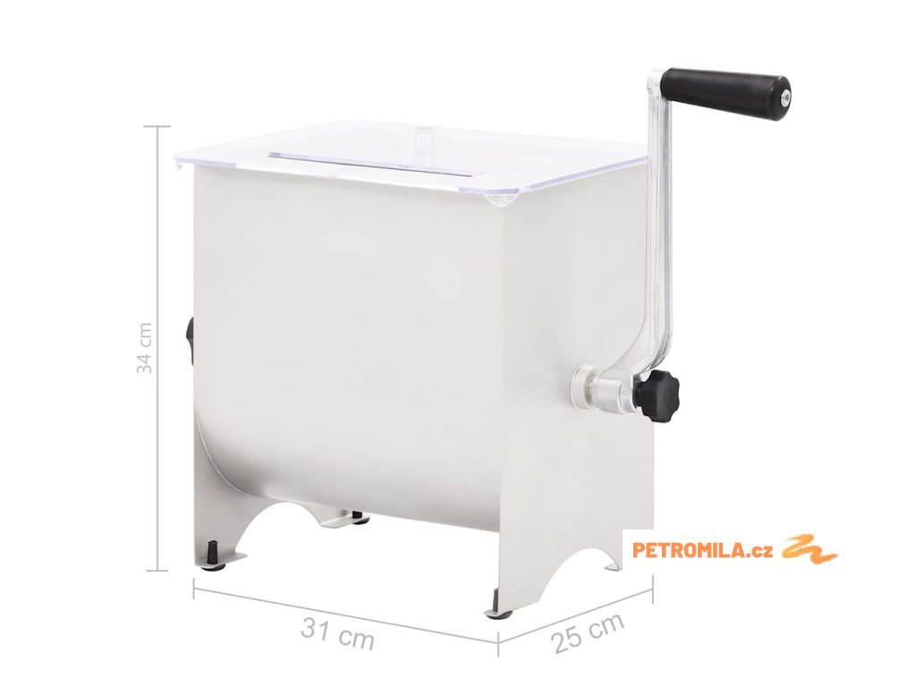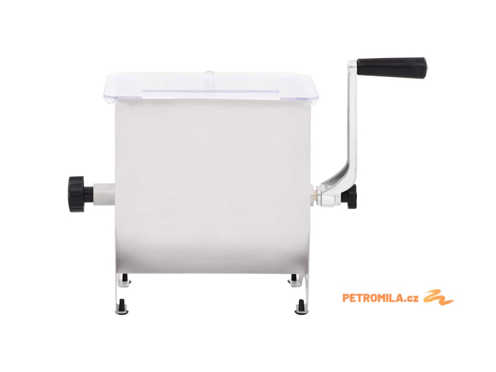 Tato výkonná míchačka masa s kapacitou až 5 kg masa je vybavená hřídelí se 4 lopatkami, které maso promíchávají směrem dovnitř, aby koření rovnoměrně a důkladně prostoupilo vaší masovou směsí. Průhledné plastové víko vám umožní sledovat stav masové směsi a dlouhá klika s rukojetí udrží vaše ruce čisté a mimo dosah čepelí. Míchačka je vyrobená z potravinářské oceli a má velmi robustní a odolnou konstrukci.