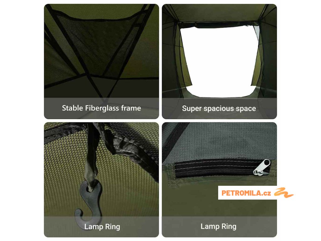 - Neprůhledná látka: Stan využívá silný polyester, který vytváří soukromý a klidný prostor, bez nežádoucího světla pro pohodlný spánek nebo klidné rybaření. Je dostatečně odolný, aby zajistil soukromí a úkryt, chrání tě před zvědavýma očima a poskytuje bezpečný prostor pro odpočinek venku.