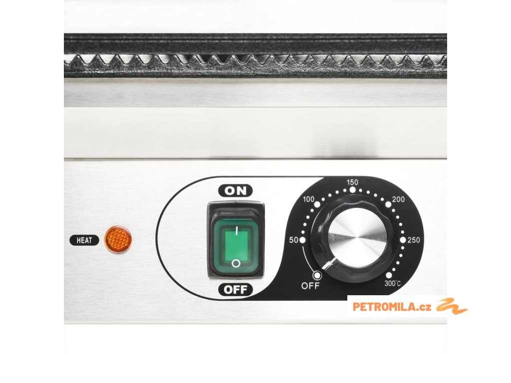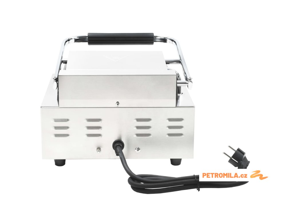 Tělo tohoto kontaktního grilu je vyrobeno z vysoce odolné nerezové oceli. Gril nejen dobře vypadá, ale je také velmi odolný a snadno se čistí. Disponuje drážkovanými litinovými plotnami, které rovnoměrně vedou teplo, a tudíž i urychlují grilování. Díky tepelné kontrolce můžete výkon grilu nastavit na nízký, střední či vysoký. Přebytečný tuk z grilu stéká do odkapávací misky, kterou lze snadno vyjmout a umýt. Součástí balení je i kartáč na čištění.