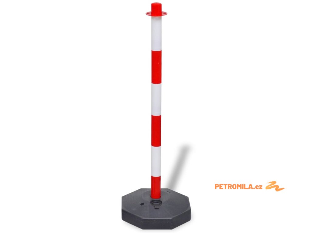 Plastový řetěz lze snadno připevnit k vymezovacím sloupkům, a vytvořit tak vymezenou oblast. Vymezovací sloupky jsou lehké, a proto velmi přenosné. Pro větší stabilitu můžete základnu naplnit vodou nebo pískem. Sada vymezovacích sloupků v jasně červené a bílé barvě je dobře viditelná.