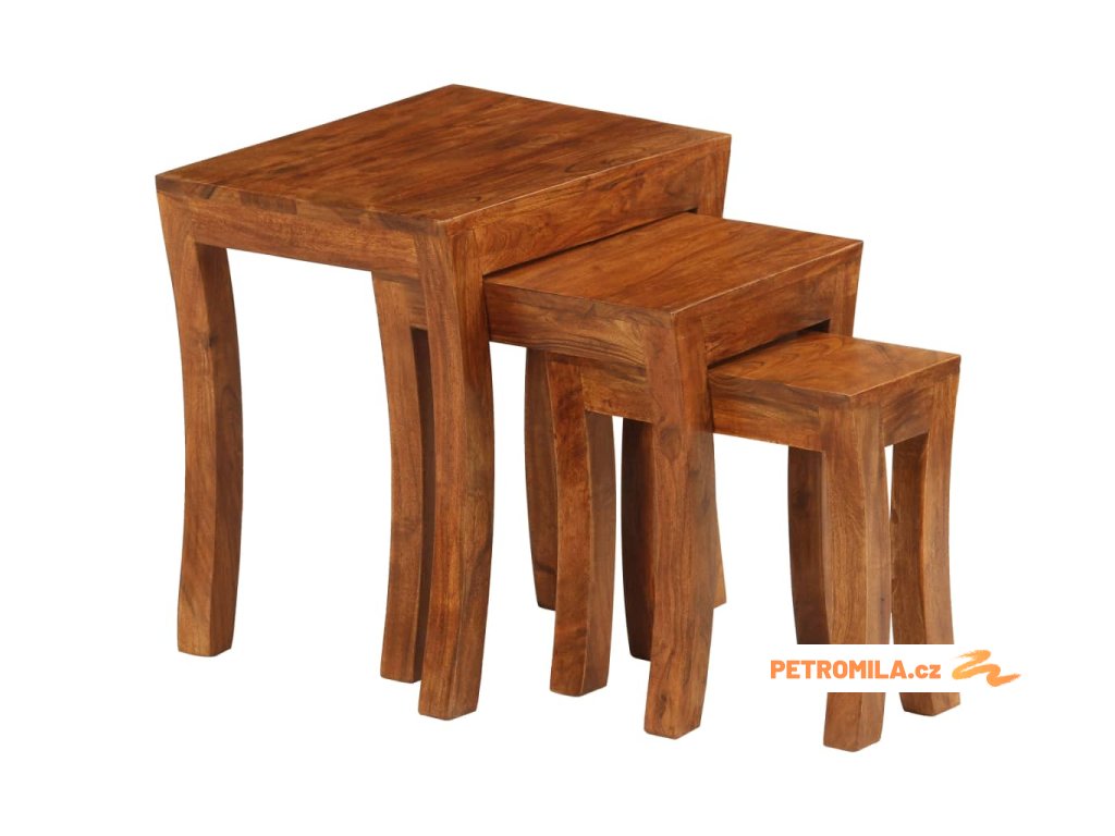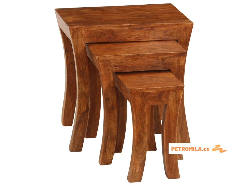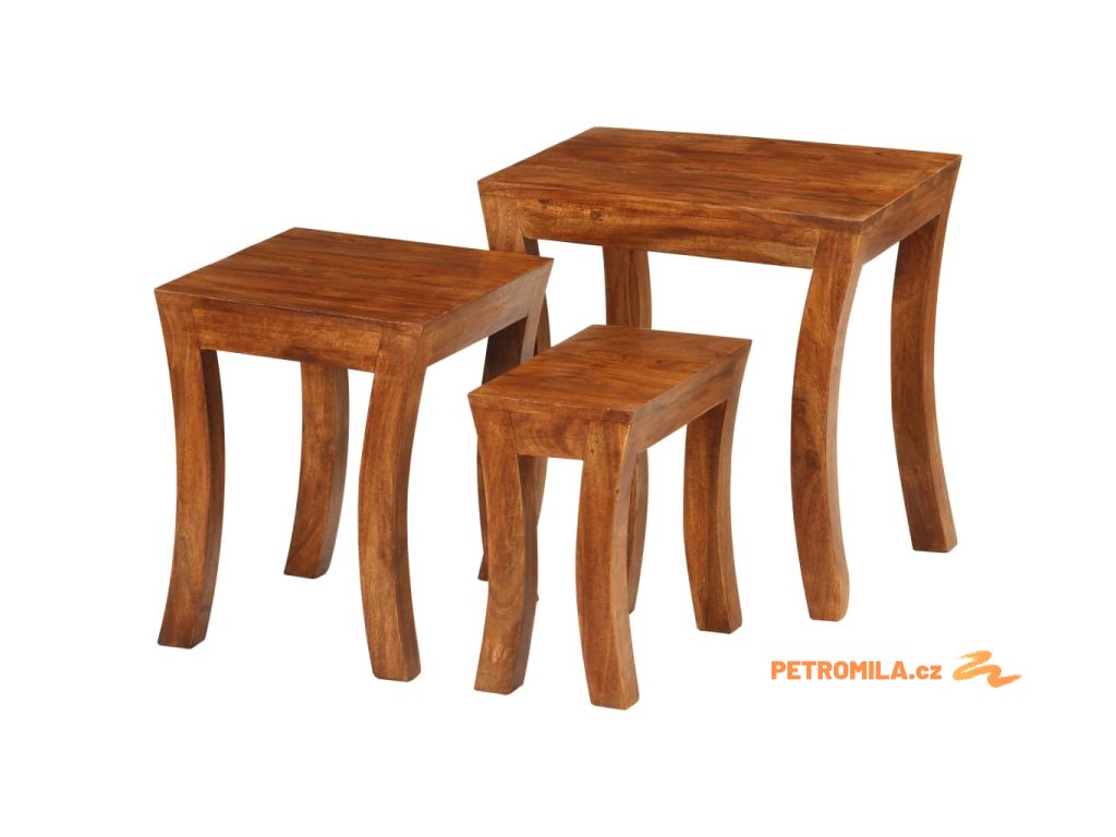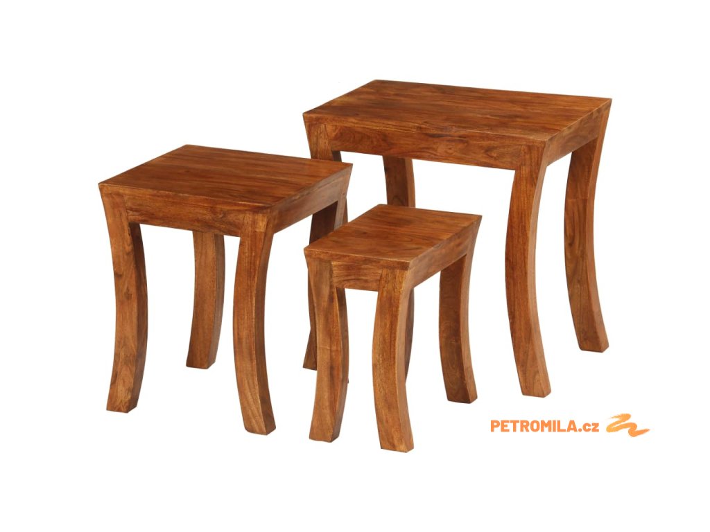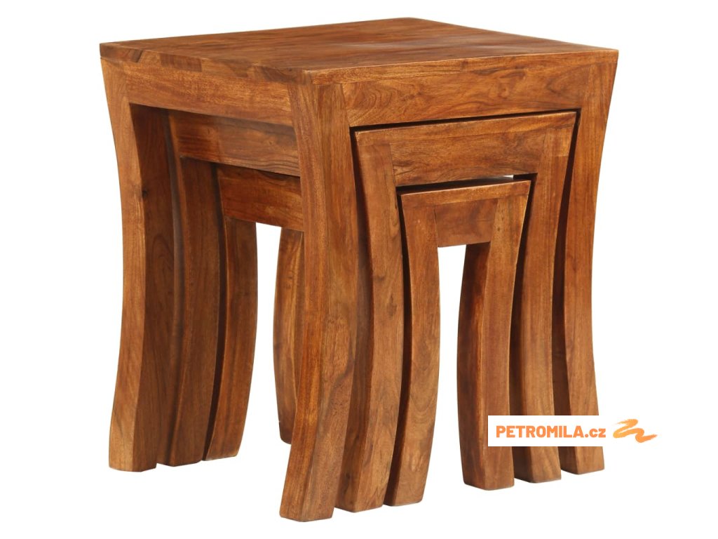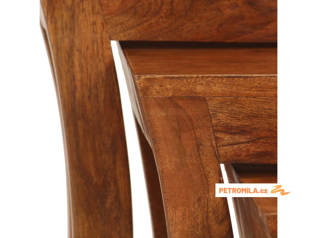 Tato 3dílná sada jedinečných hnízdových stolků je zhotovená z masivního akáciového dřeva s rustikálním vzhledem a medovou povrchovou úpravou a stane se nadčasovým doplňkem vašeho bydlení. Můžete jej také používat jako konferenční stolky, přístavné stolky, odkládací stolky nebo noční stolky.