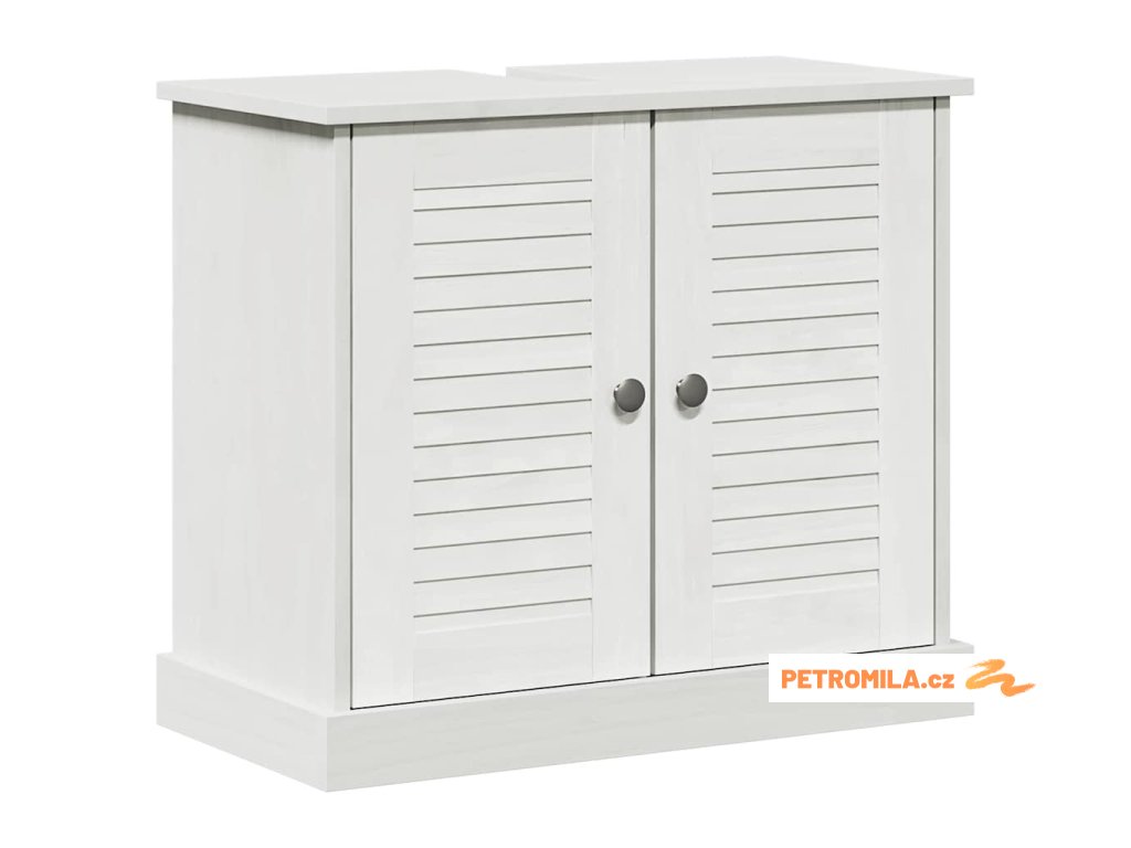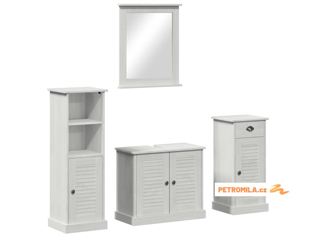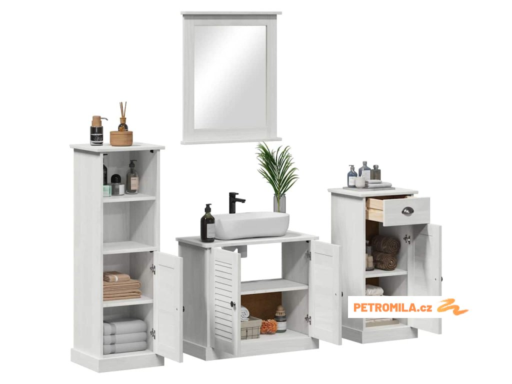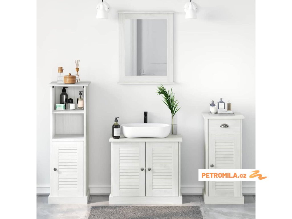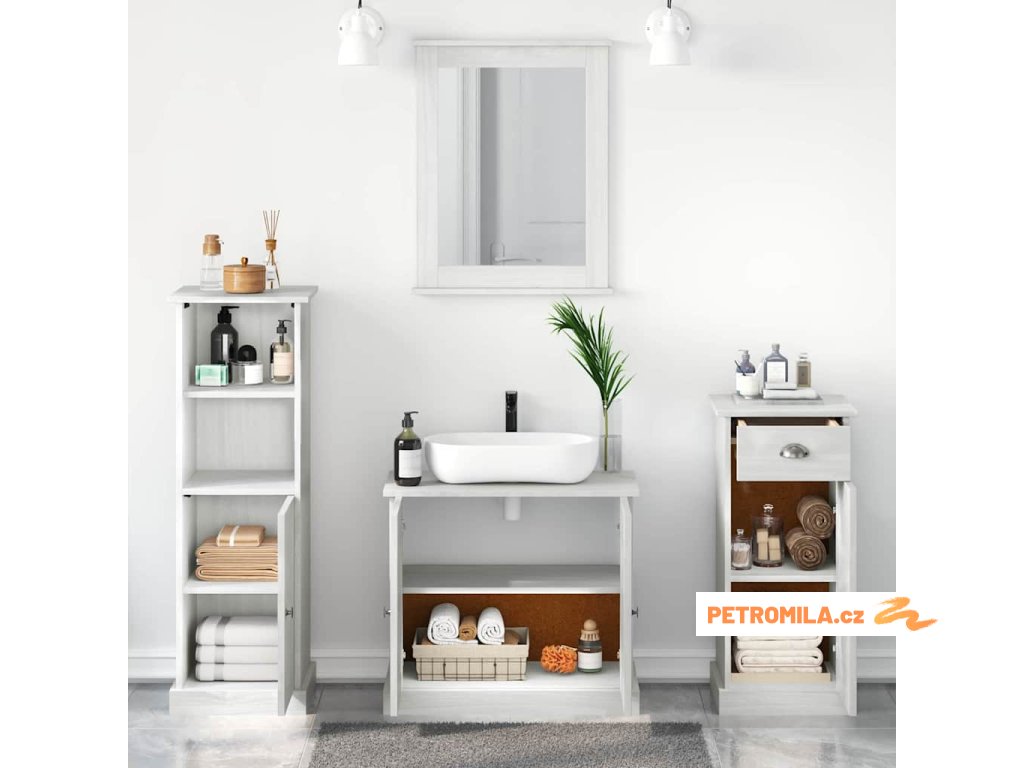 Masivní Konstrukce z Borového Dřeva Tato sada je vyrobena z vysoce kvalitního masivního borového dřeva, známého svou odolností a nadčasovým vzhledem. Přírodní textura dřeva zvýrazňuje rustikální eleganci, odolává každodennímu používání a nabízí trvalou přírodní krásu. Vhodná pro každého, kdo chce do svého domova začlenit organické prvky.,Patented Plane Mirror Se svým plochým zrcadlem je to ideální volba pro každodenní úpravy a pozorování symetrie dekoru. Nabízí přesná a přímá odrazy, které odpovídají velikosti vašeho obrazu, což činí toto zrcadlo velmi vhodným pro různé úkoly úpravy.,Dveře na Pantech s Knoflíkovými Rukojetmi Tato sada využívá dveře na pantech, což usnadňuje přístup do interiérů, aniž by to měnilo uhlazenou estetiku. Knoflíkové rukojeti umožňují bezproblémové používání a dodávají dotek vintage gráce rustikální atmosféře sady.,Policové Desky pro Prostorné Úložiště Policové desky v sadě poskytují prostorný prostor pro vaše potřeby, podporující organizované úložiště. Ať už pro ručníky, kosmetiku nebo jiné nezbytnosti, efektivně využívají vertikální prostor a přitom si zachovávají minimalistický vzhled.,Odolnost vůči Teplu Odolnost nábytku vůči teplu znamená, že vydrží teplé prostředí, zajišťující prodlouženou efektivitu i při kolísajících teplotách. Tento prvek zajišťuje, že váš nábytek zůstane v nejlepším stavu, což je ideální pro koupelnová prostředí.- Barva: Bílá s patinou